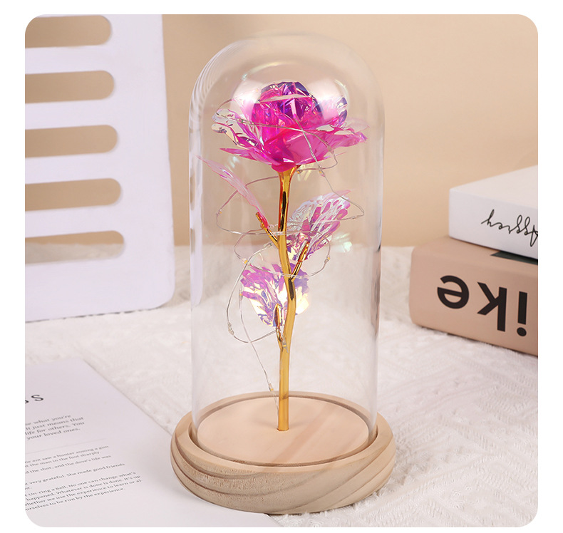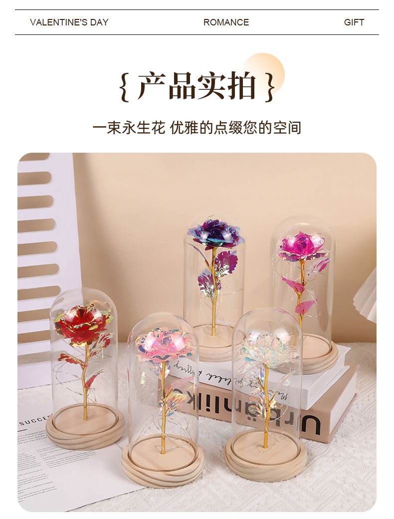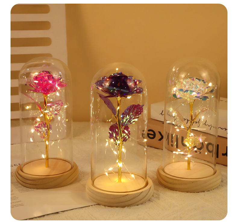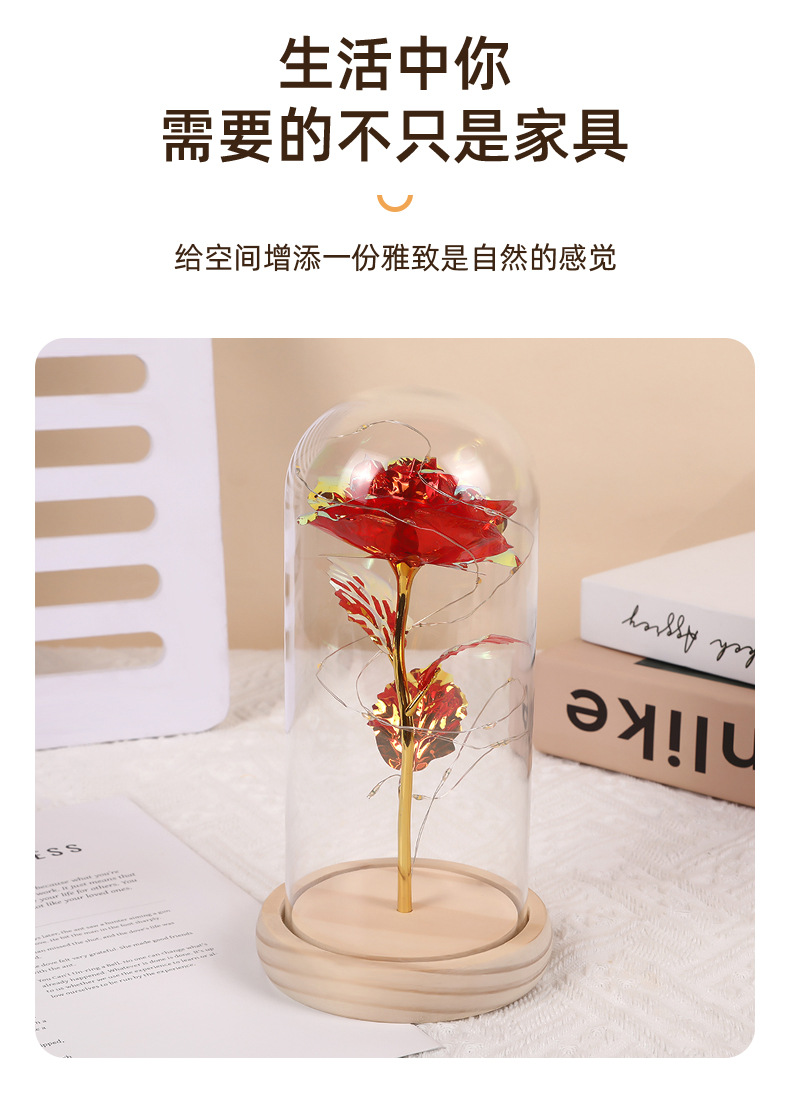 Цветная золотая фольга Роза Стеклянный колпак Деревянная основа Ночной свет Подарок на День святого Валентина Оптовая продажа Цветы праздника