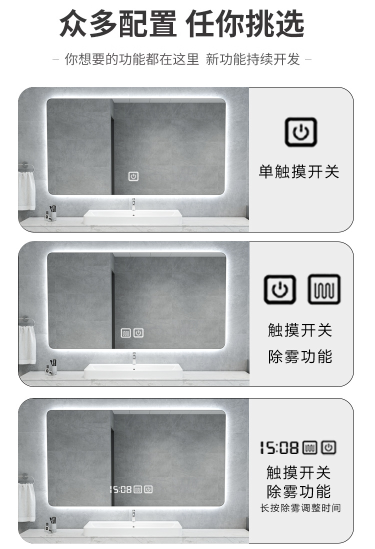 ![]() | Horizontal backlight + double touch + three-color light + defogging + time temperature | 70cm*90cm | ¥261.5 / ≈ 3 159 ₽ | 9991 | 5093380621274 | |