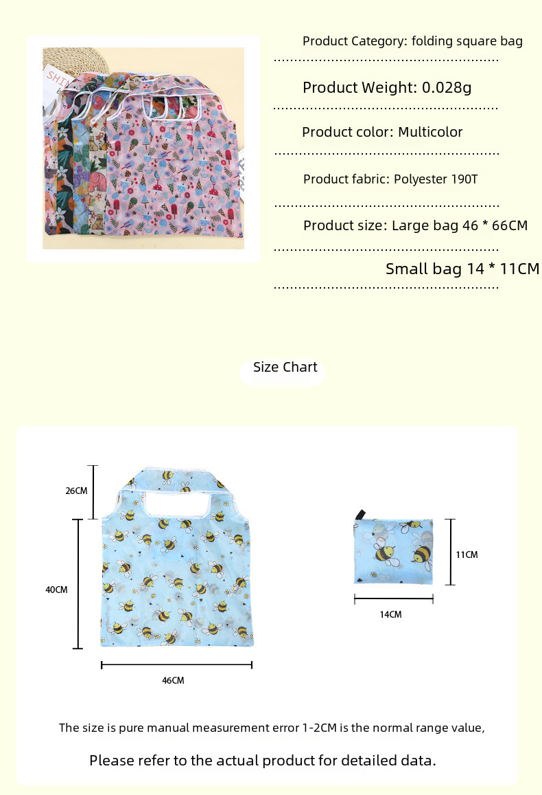 - High-Quality Material:Made from 190T material, this shopping bag is durable and long-lasting, ensuring you get the most out of your purchase.