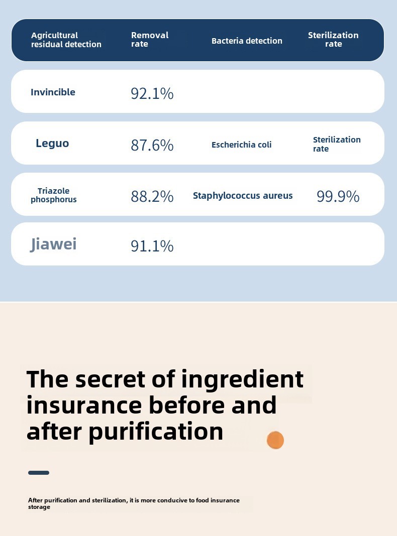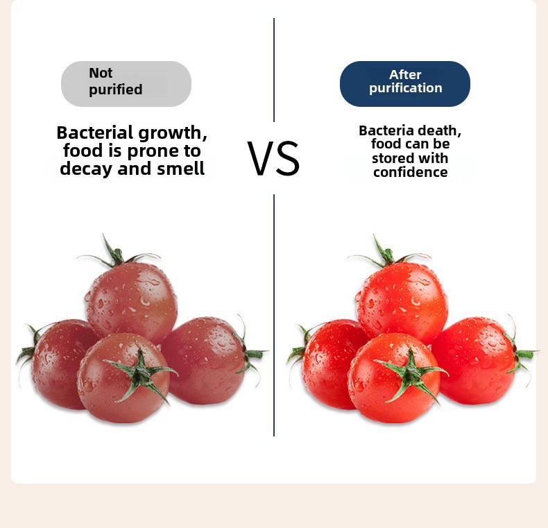 - Fruit and Vegetable Specialty:Designed specifically for fruits and vegetables, this purifier helps to maintain the natural taste and nutrients of your fresh produce.