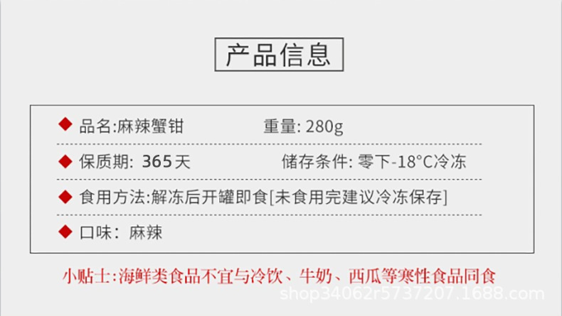 📦 | Spicy crab claws (280g/can) | 2шт: ¥17.00, 30шт: ¥12.00, 120шт: ¥11.00 | 4701 | 5147817057274 |