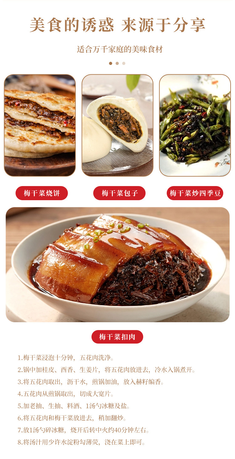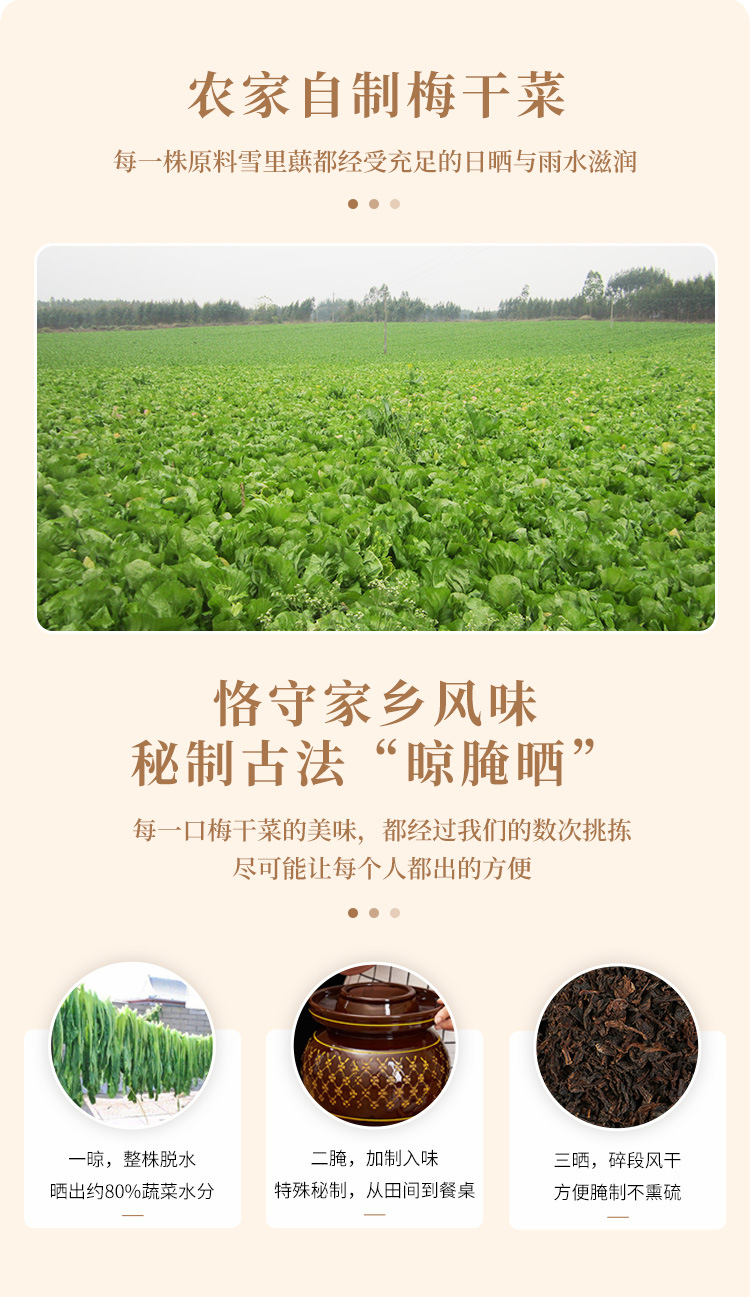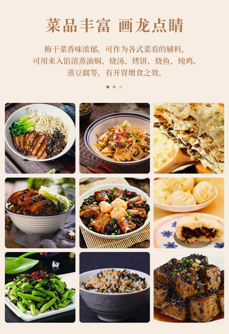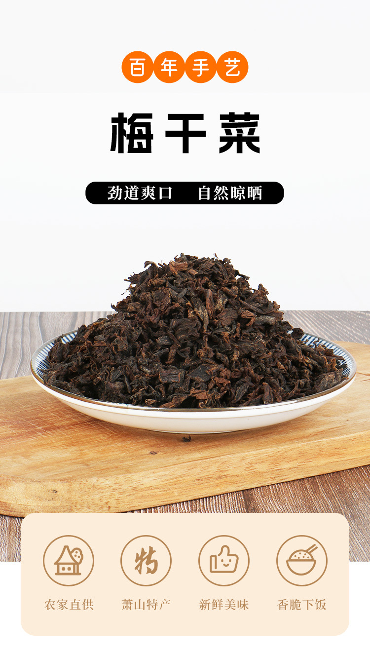 【温馨提示】:本店经营各类梅干菜,量大从优,欢迎各位朋友选购!图片均为本店产品实物拍摄,可能因为拍摄光源的问题,有少量色差,但是我们会尽力展示产品真实的面貌,支持加工定制、大货批发、一件代发.
