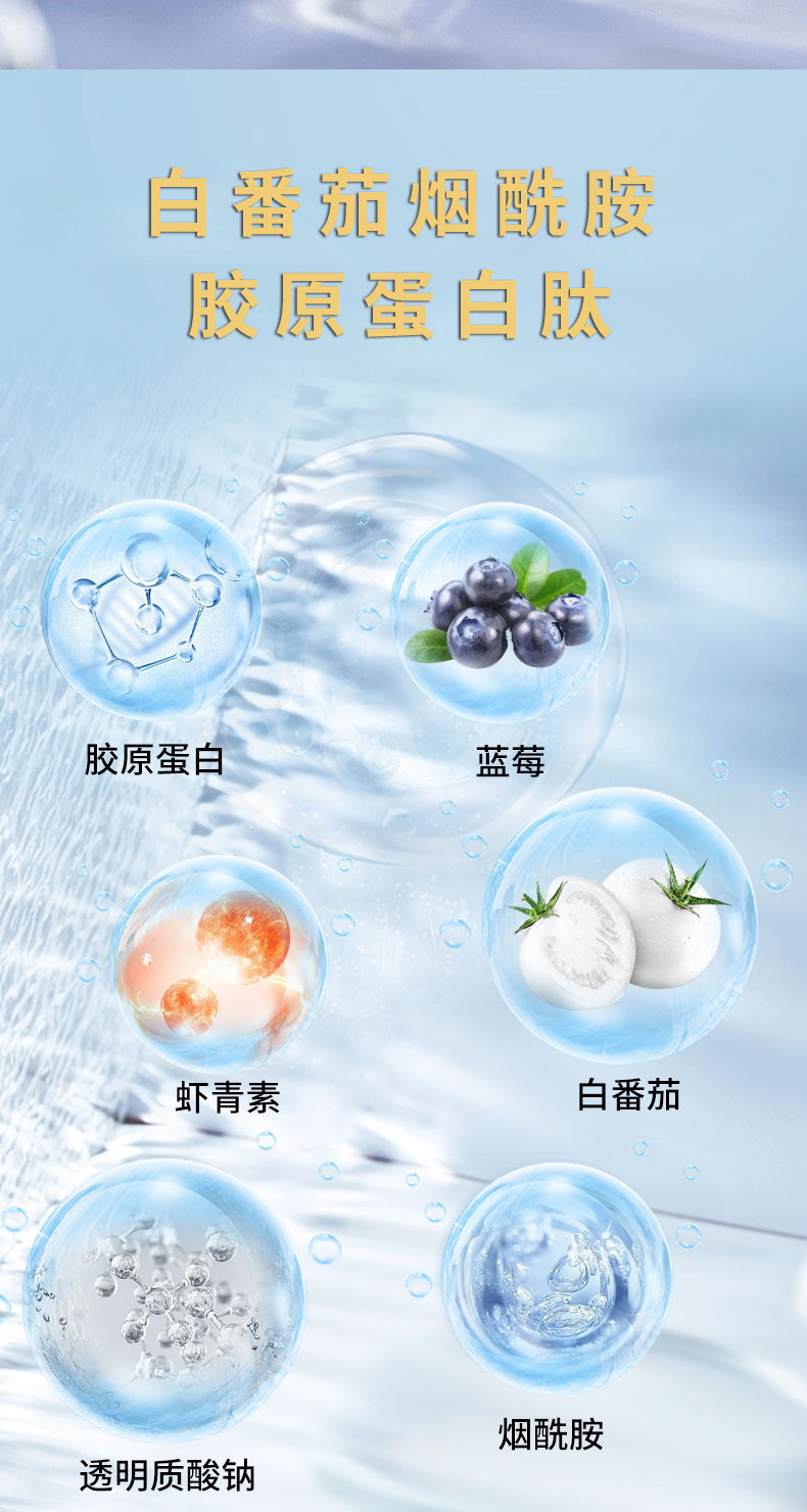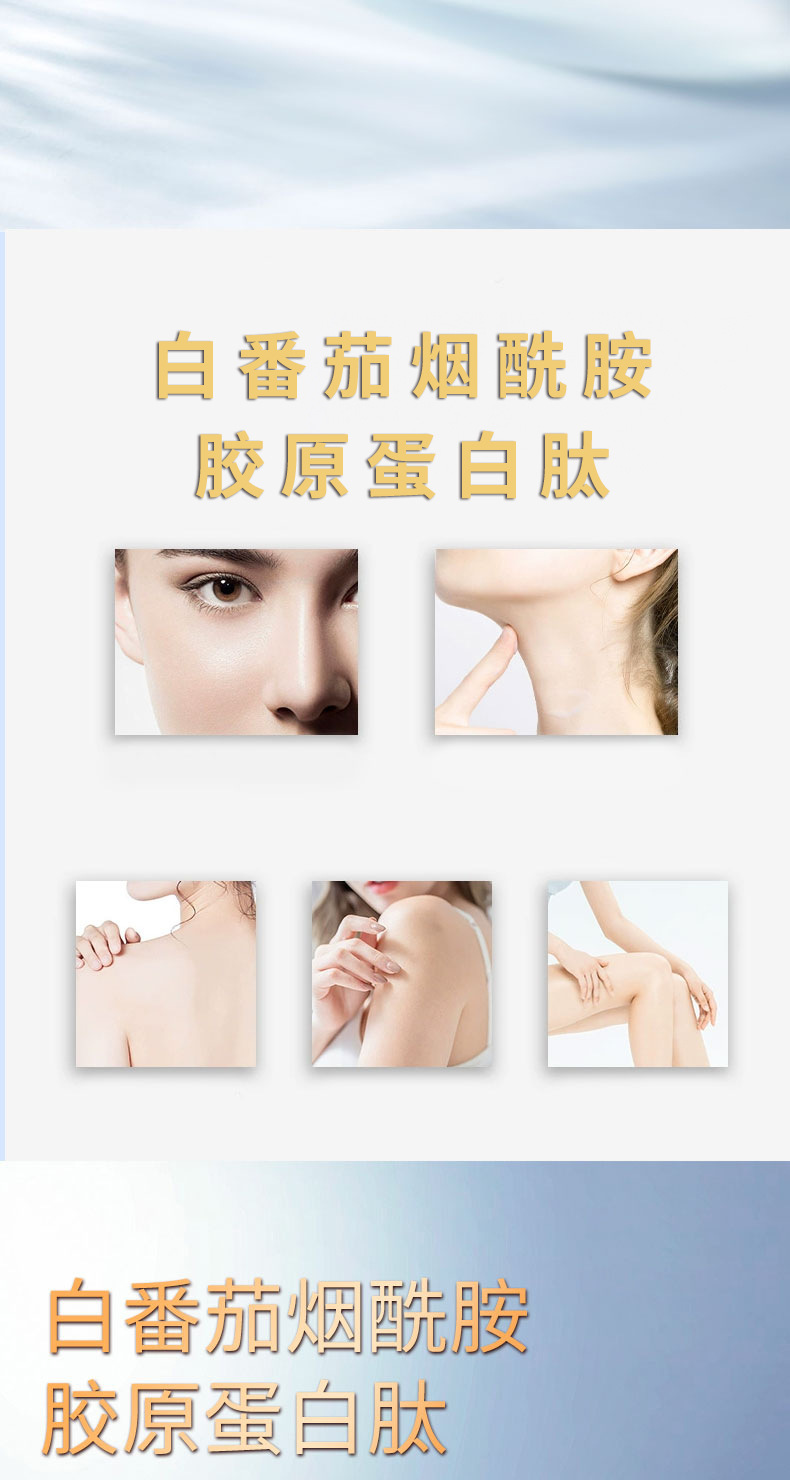 Основные сырьевые материалы White tomato nicotinamide, fish collagen peptide, haematococcus pluvialis, sodium hyaluronate, etc