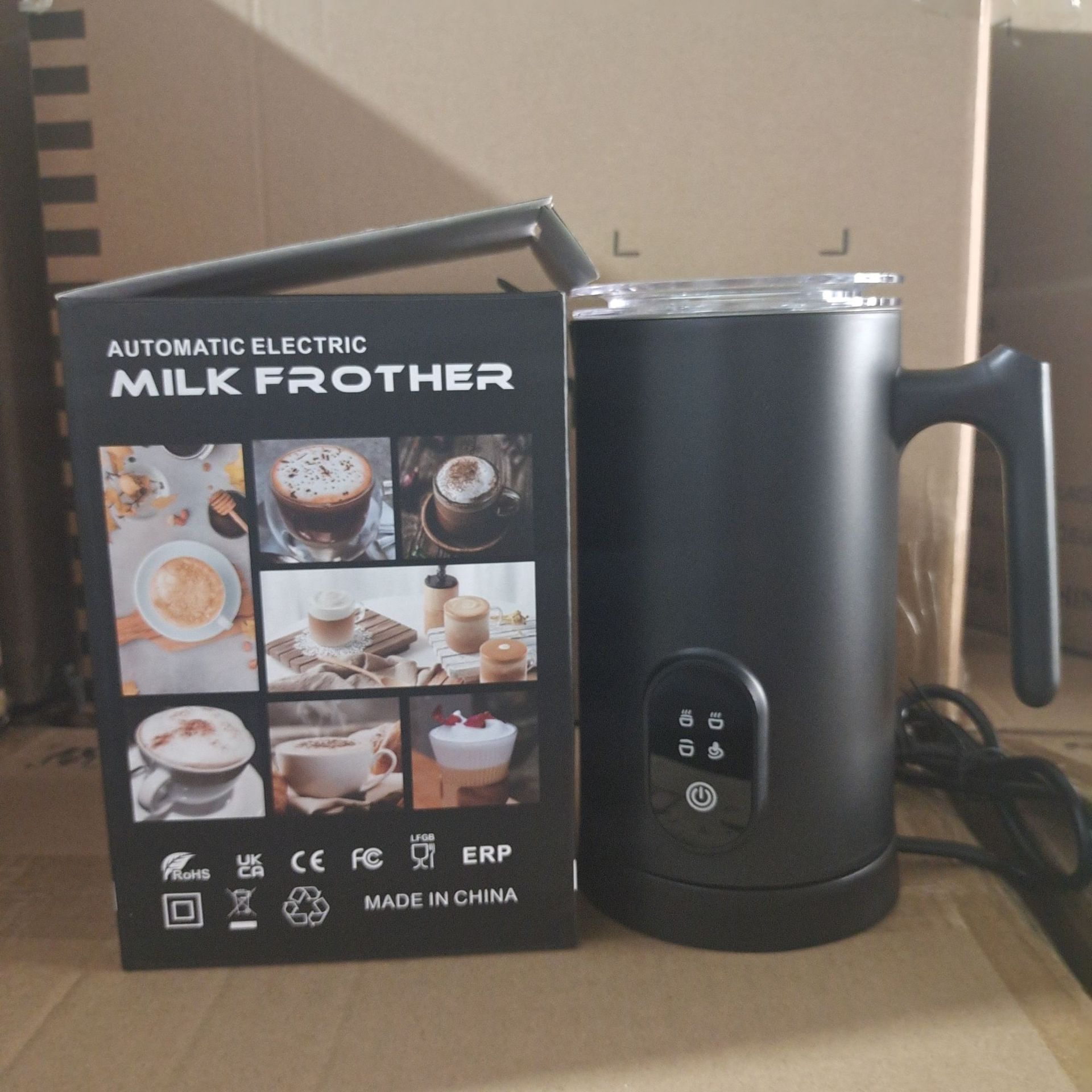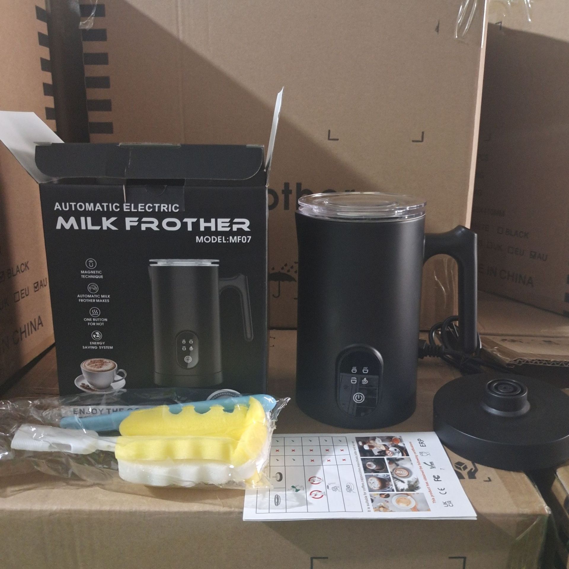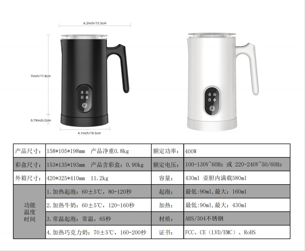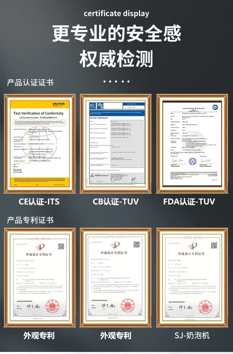 此款多功能奶泡机为出口版,包装印刷,说明书全英文,有多国认证: