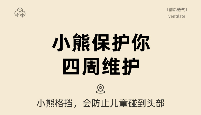 当您的宝宝长大一些,需要一个靠背来支撑他的头部时,这款座椅特别设计了一个可以靠着的小熊头部加固结构,让宝宝在行车过程中能够拥有一个安全、舒适的休息场所,有效防止刹车顶住宝宝头部,确保宝宝的安全。