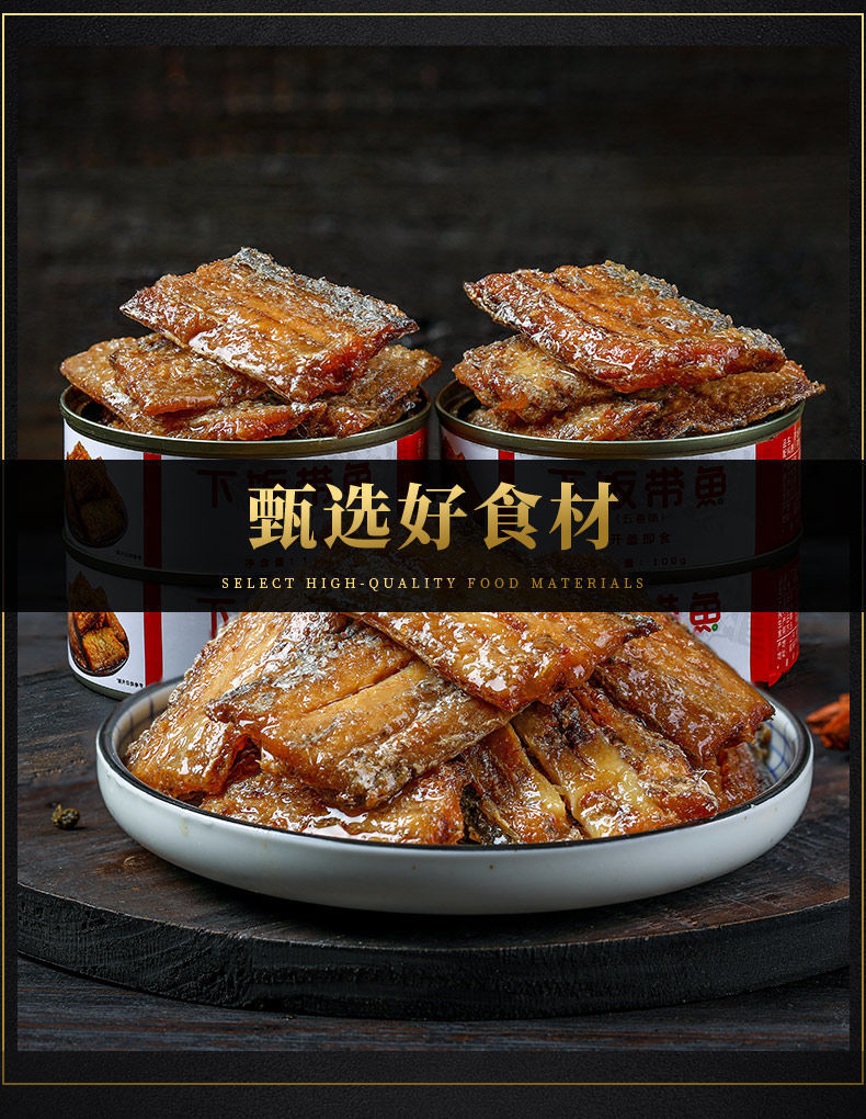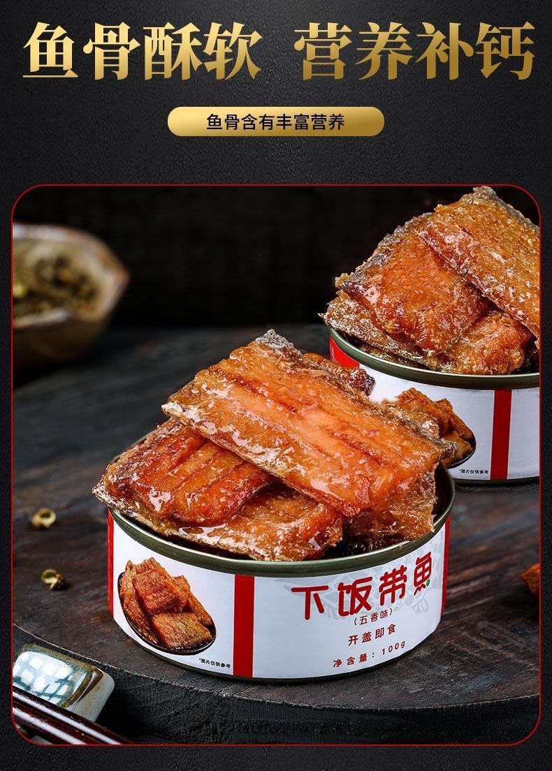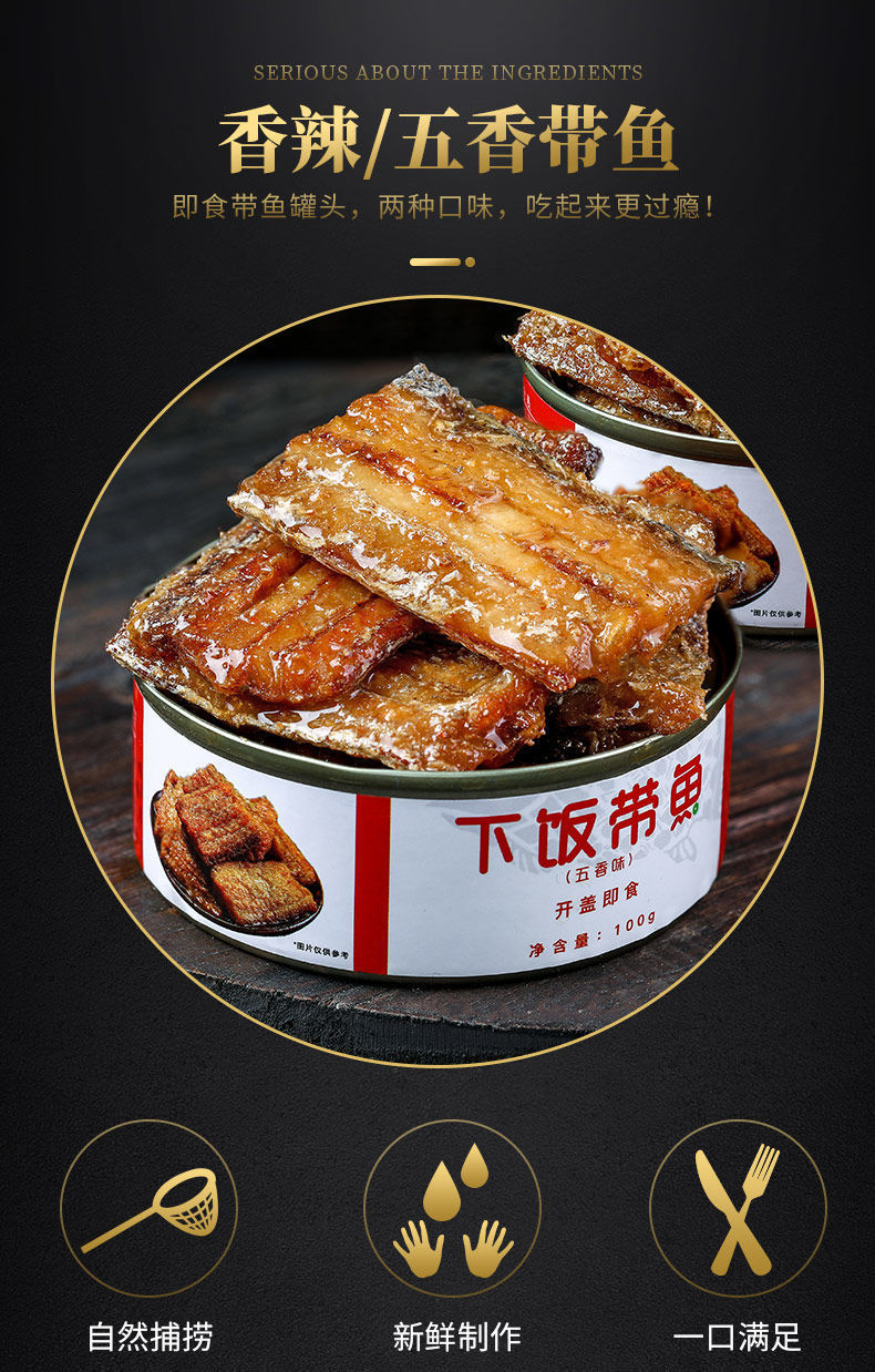 📦 | Spiced flavor (100g canned hairtail factory wholesale) | 100g canned fish can be oem | 1шт: ¥2.20, 20шт: ¥2.00, 100шт: ¥1.80 | 92285 | 5178419816768 | |