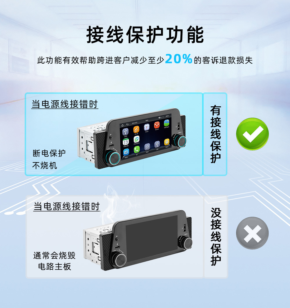 ♦接线保护功能直接帮跨境客户减少至少20%客诉退款损失(跨境客户零售到国外,客人自己安装接线,正负极分不清接错时候正常会直接烧坏机器主板或者保险丝,导致客诉退货或者差评,我司最新研发此产品电源线随便接N次都不会烧机器和保险丝,直到客户接对为止);