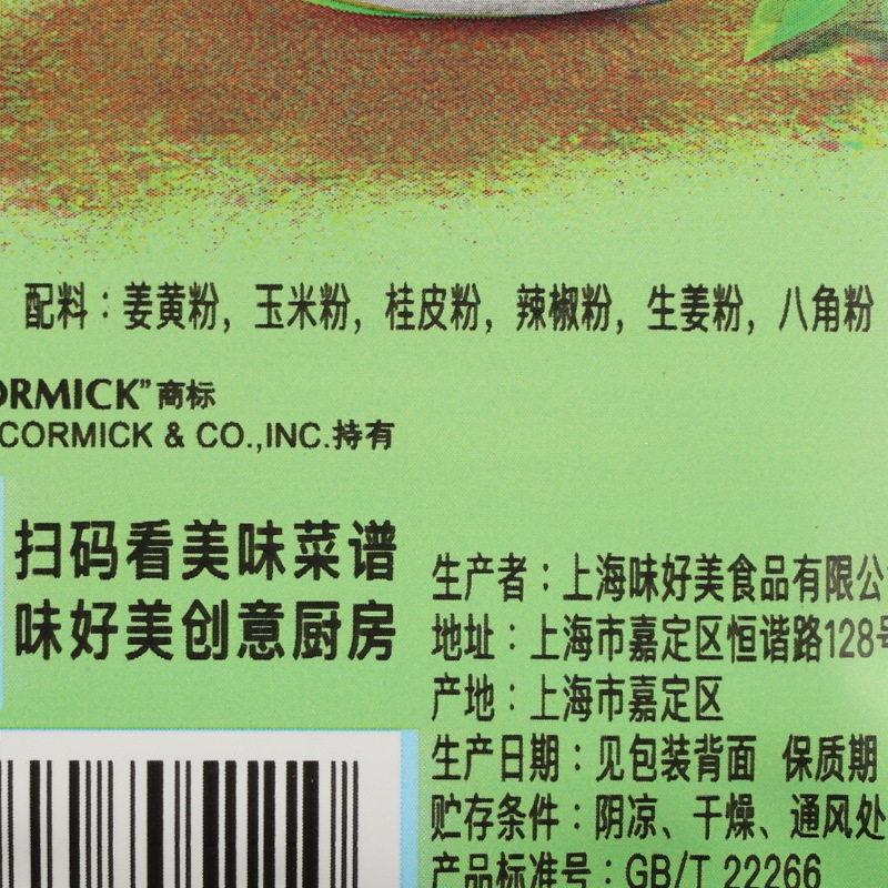配料表:姜黄粉、玉米粉、桂皮粉、辣椒粉、生姜粉、八角粉等,以产品外包装实际信息为准。