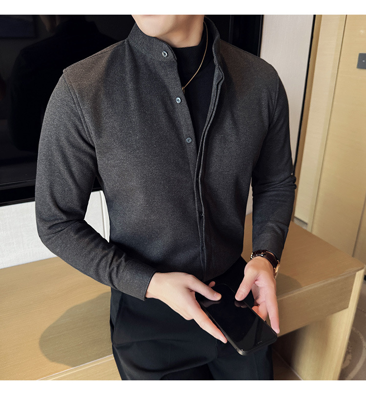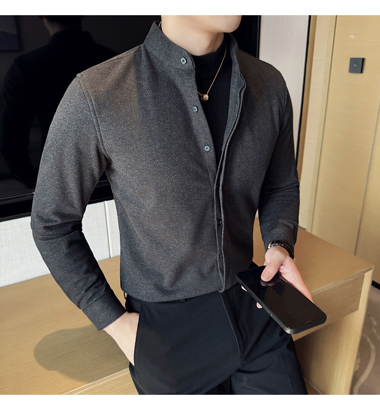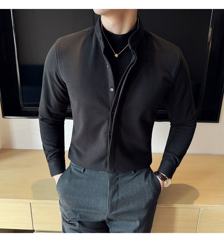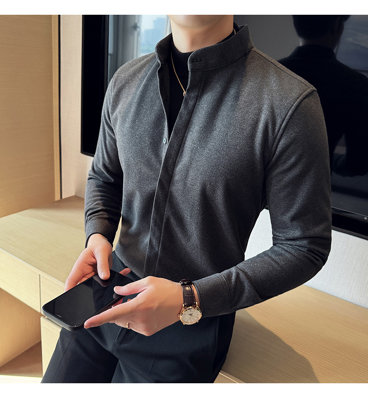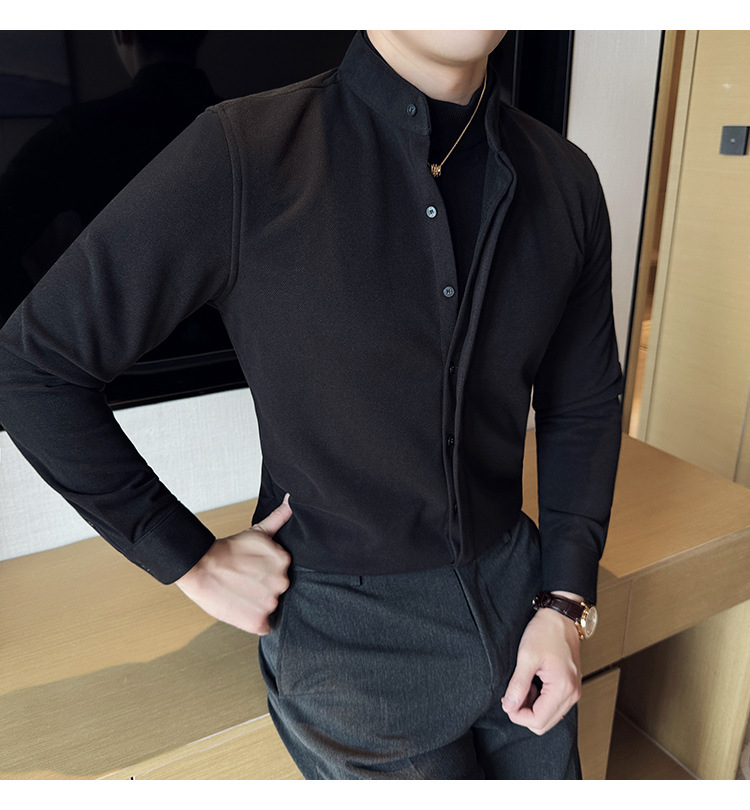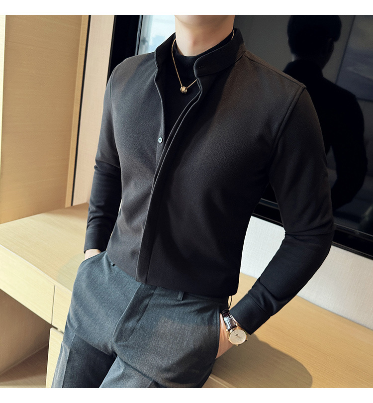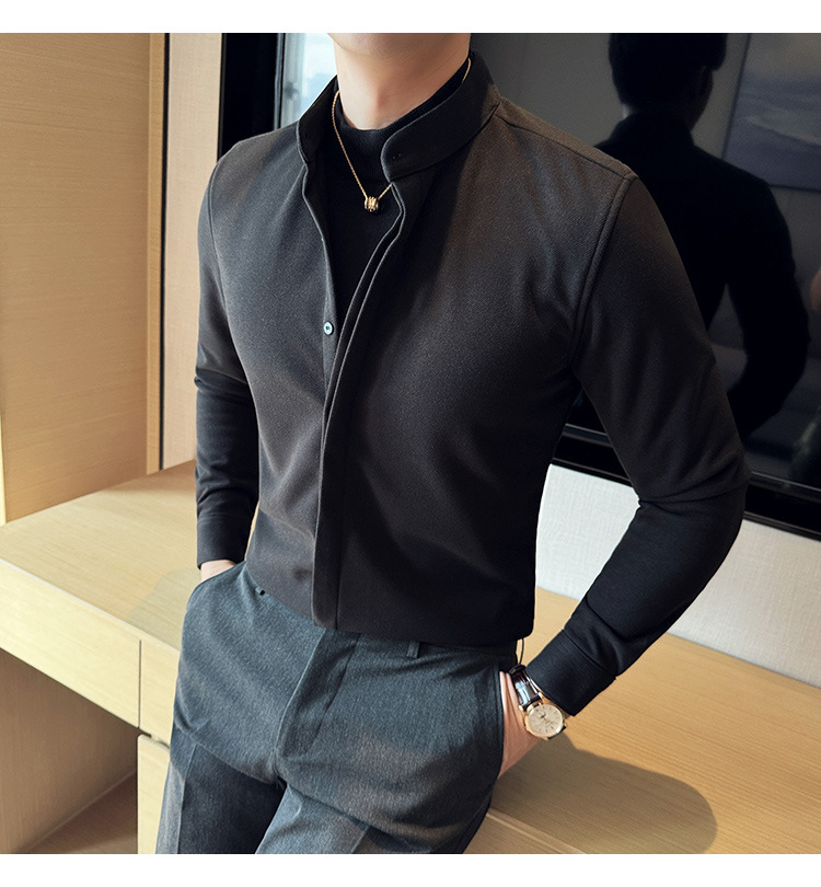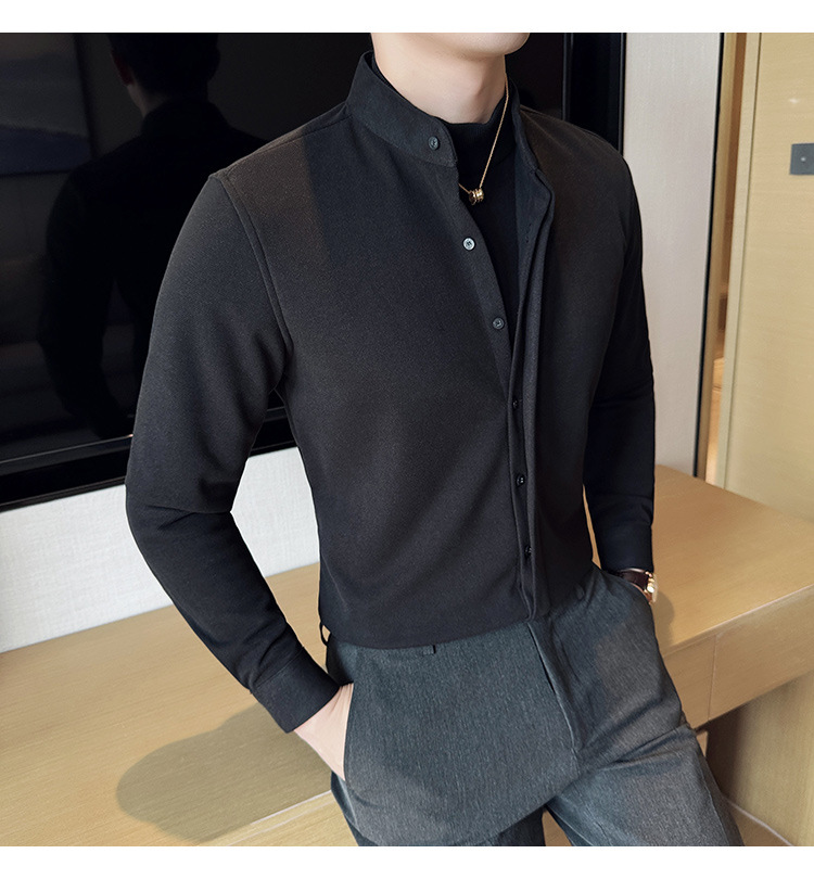 Рубашка с стойкой из шерсти для мужчин, длинный рукав, приталенный, с рюшами, высокого качества, бизнес-кэжуал, фальшивый двусторонний вязаный свитер