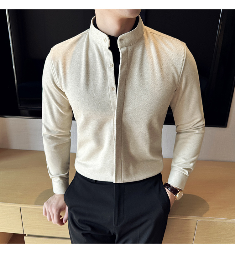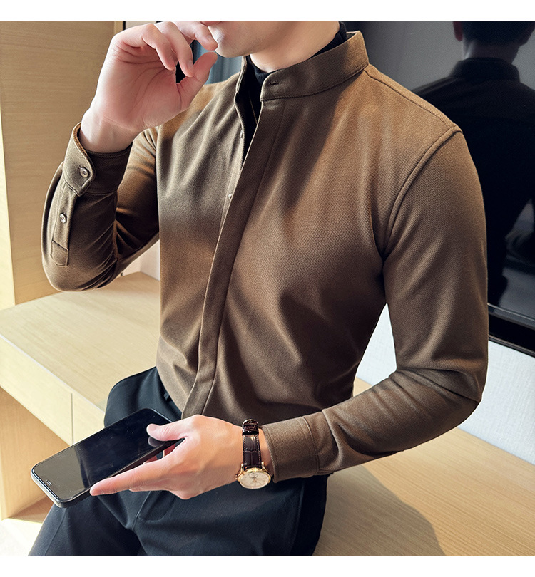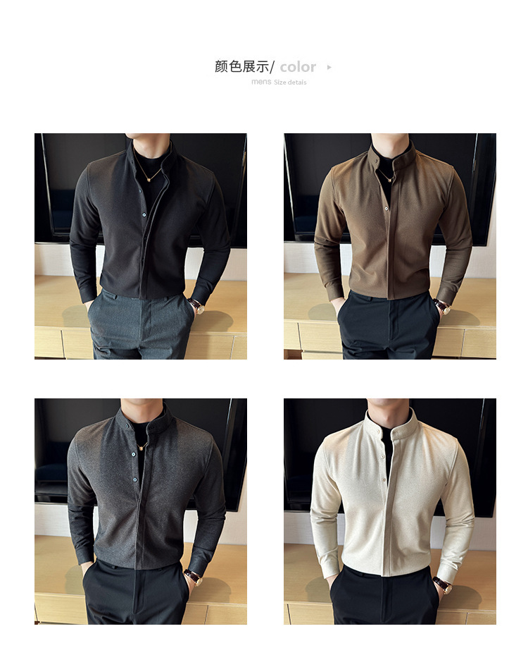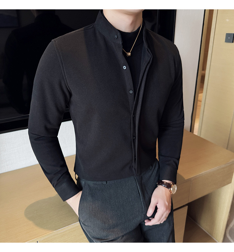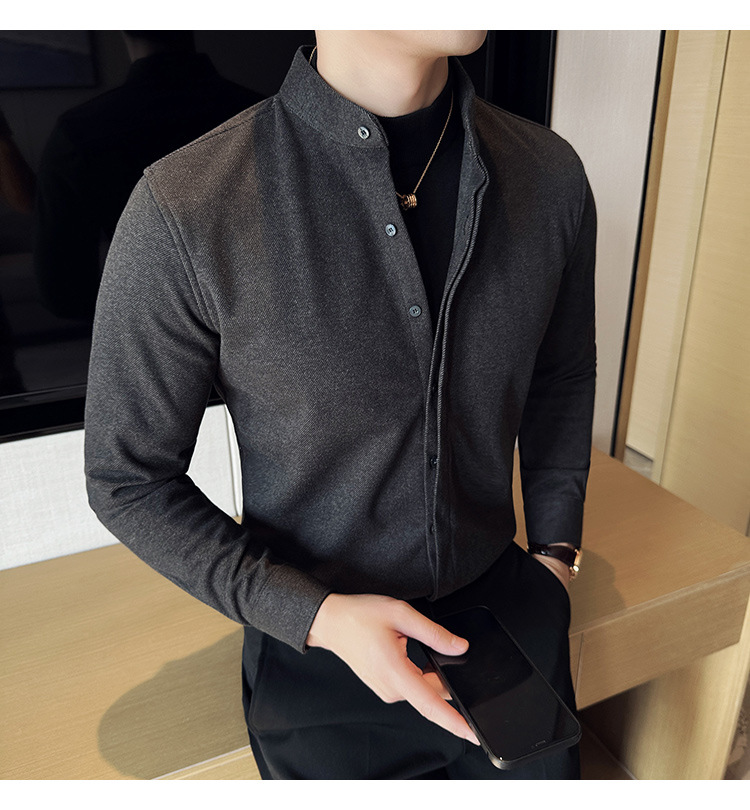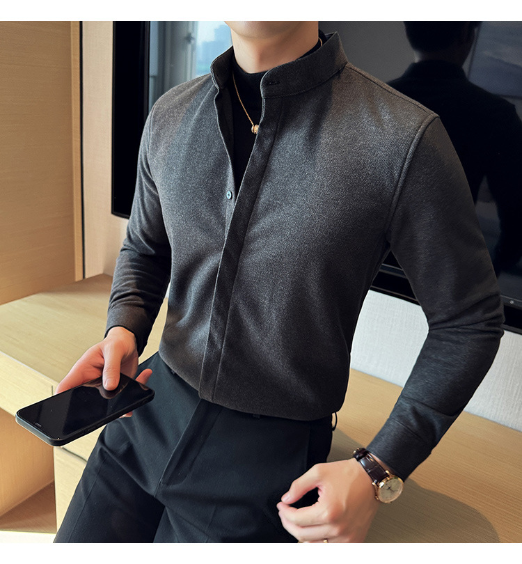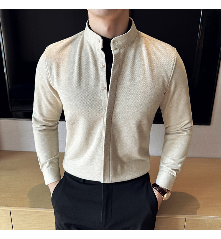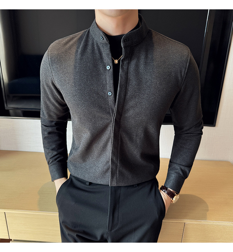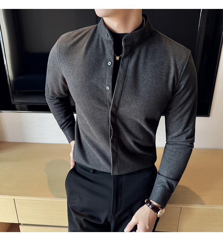 Рубашка с стойкой из шерсти для мужчин, длинный рукав, приталенный, с рюшами, высокого качества, бизнес-кэжуал, фальшивый двусторонний вязаный свитер