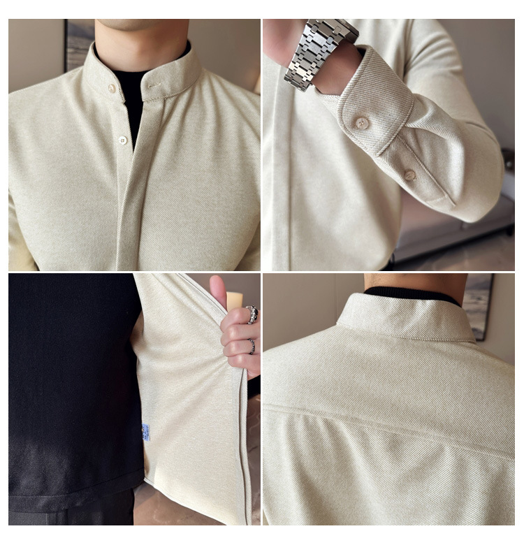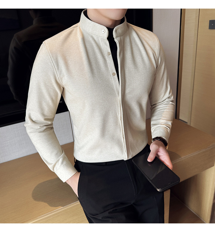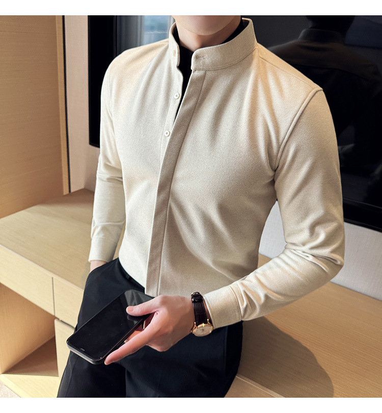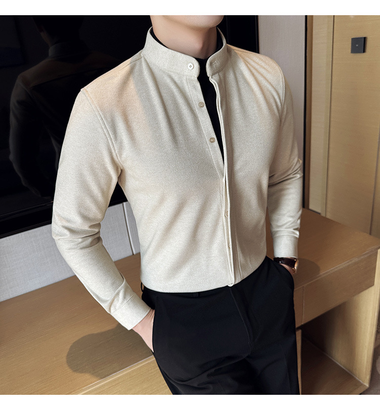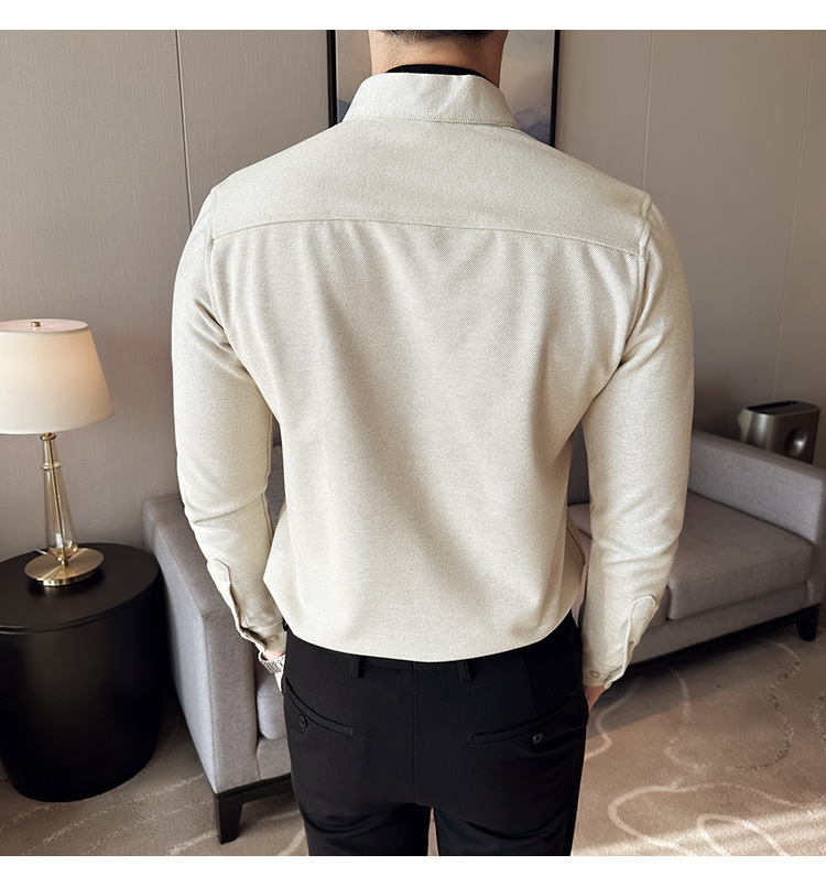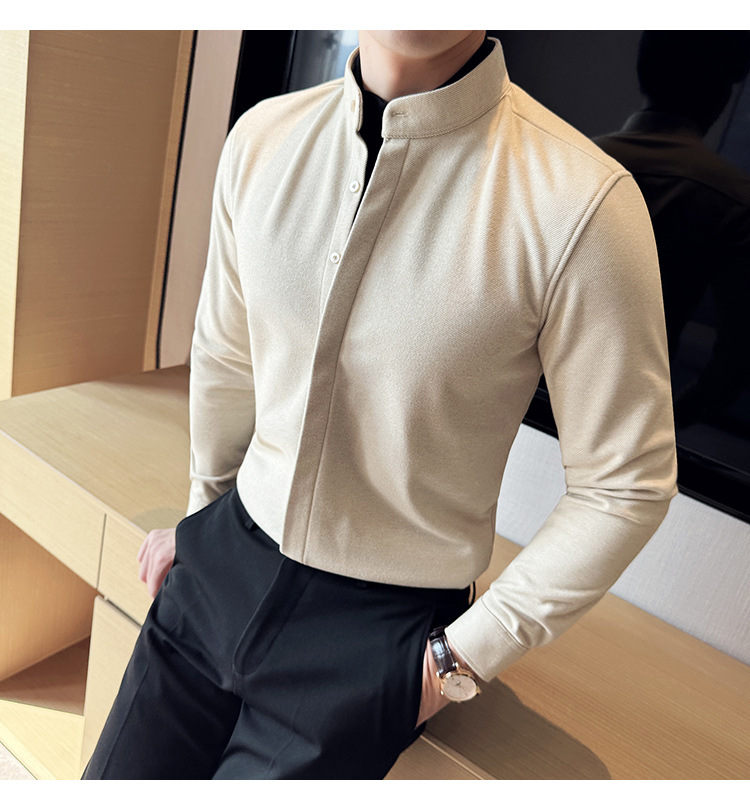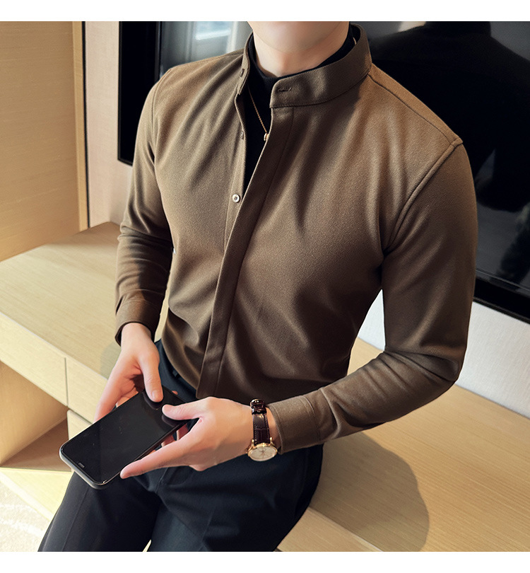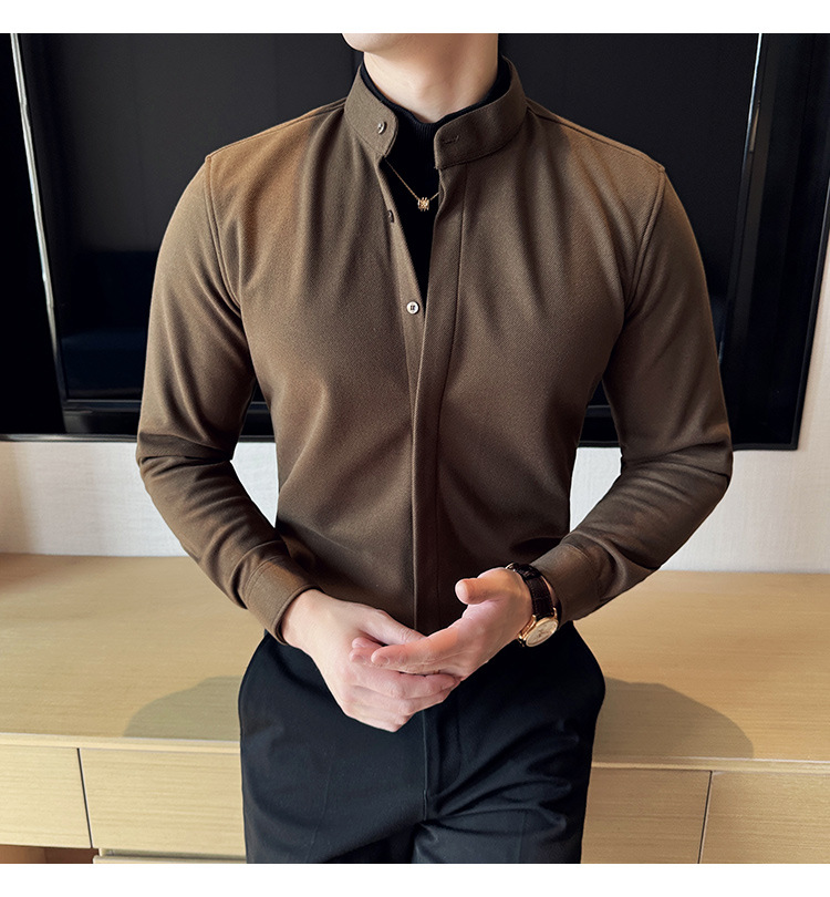 Рубашка с стойкой из шерсти для мужчин, длинный рукав, приталенный, с рюшами, высокого качества, бизнес-кэжуал, фальшивый двусторонний вязаный свитер
