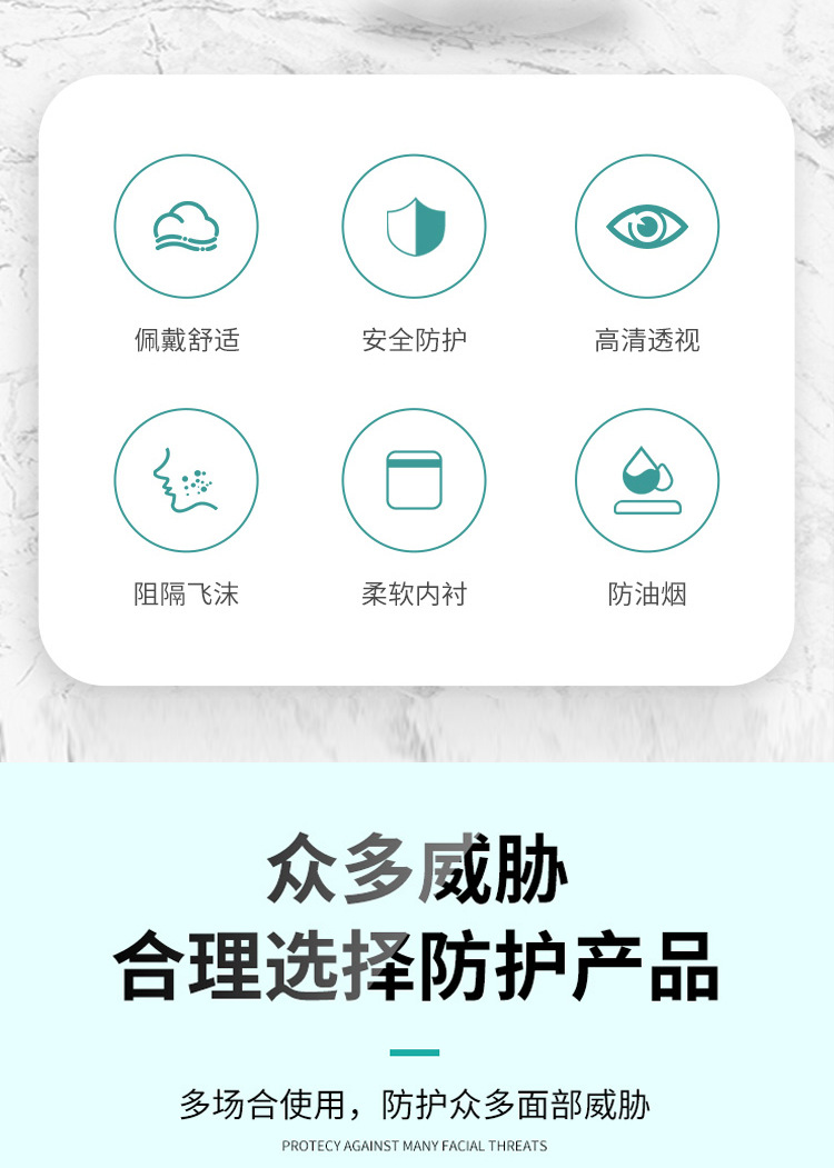 Область применения Anti-oil smoke, anti-droplets, anti-dust, anti-impact, protect the face