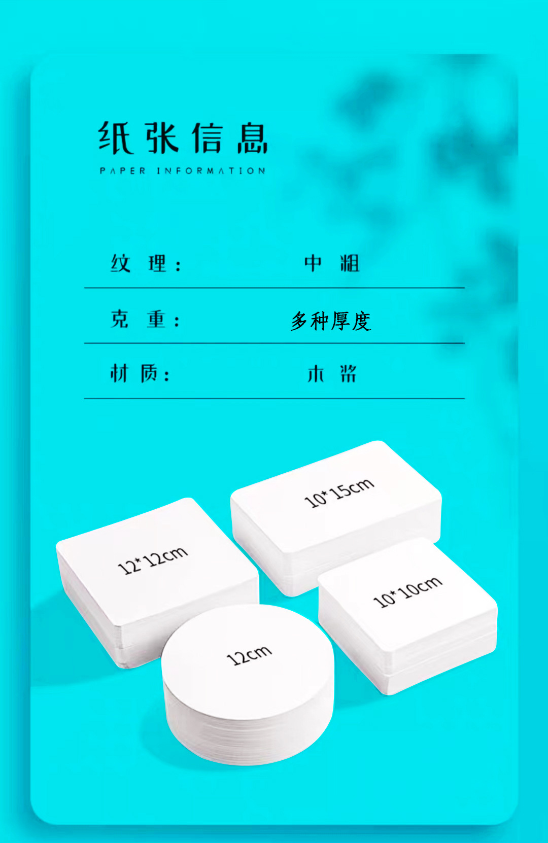 本产品为定制商品,常规规格为:10X10cm 10X15cm 12X12cm(圆形),如需定制其它规格、克重请联系客服。