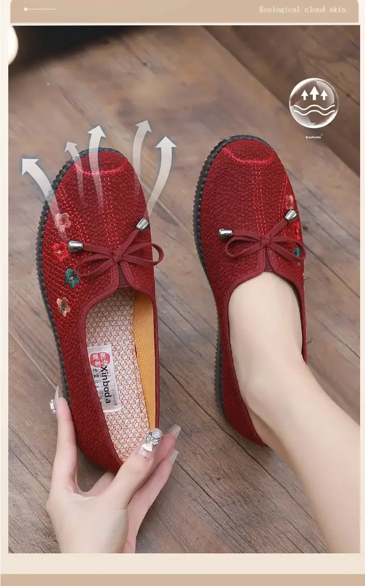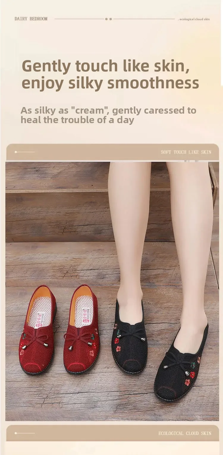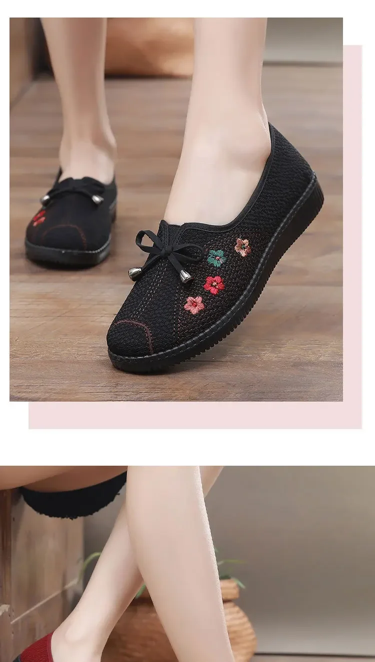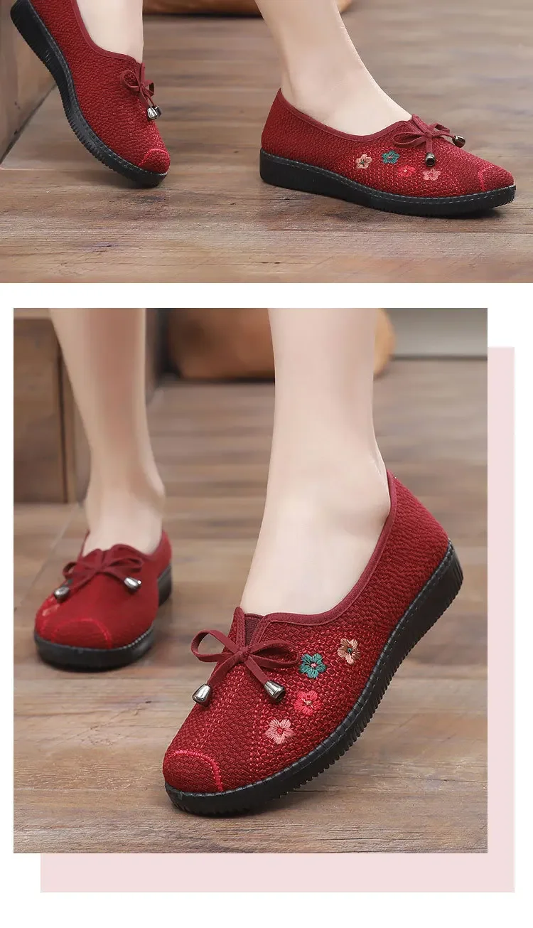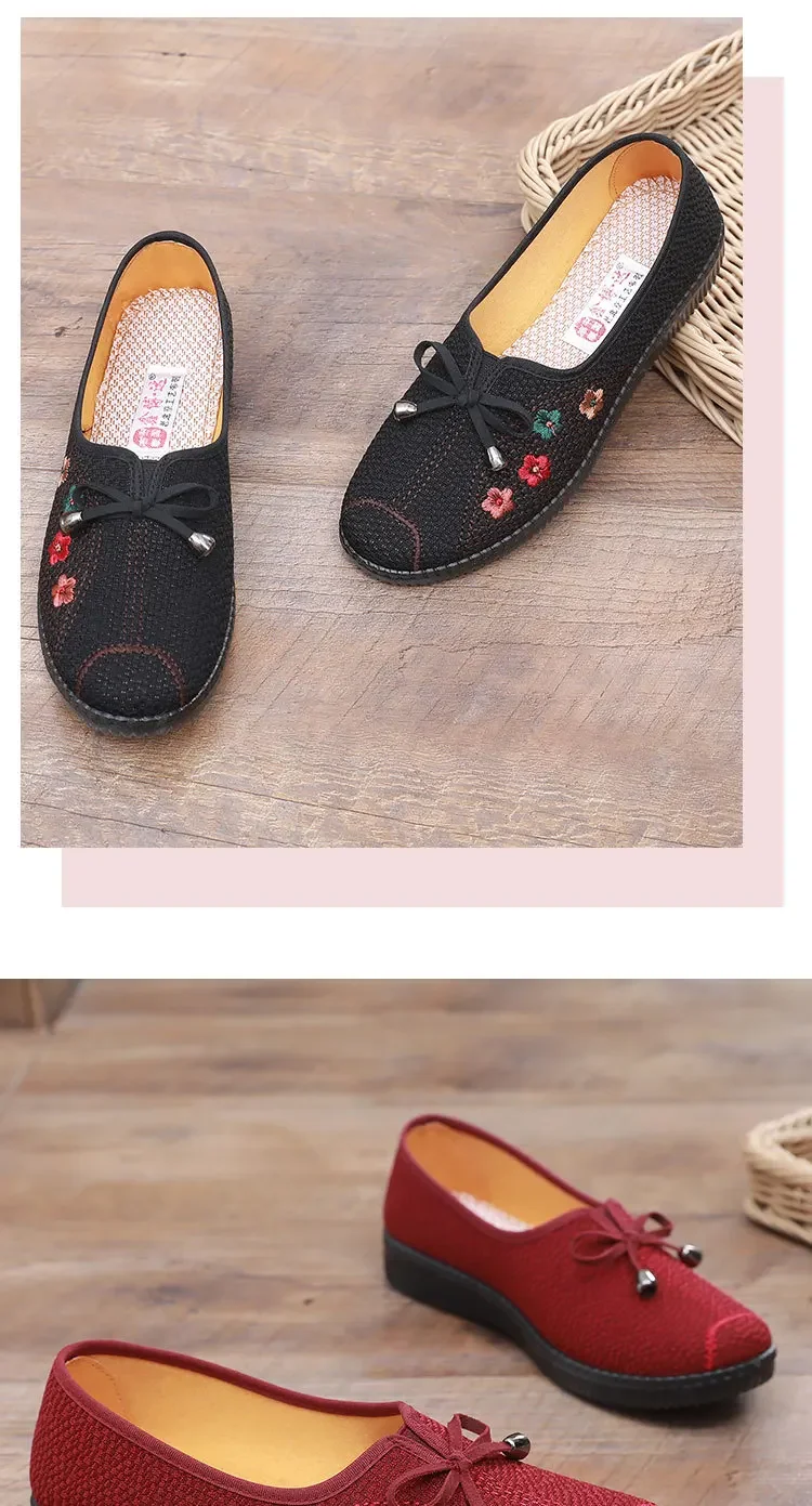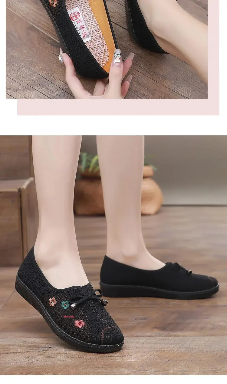 Женская обувь 2024 года, весенние новые туфли для мамы среднего и пожилого возраста, плоский каблук, мягкая подошва, мягкая поверхность, вышитые тканевые туфли, оптом