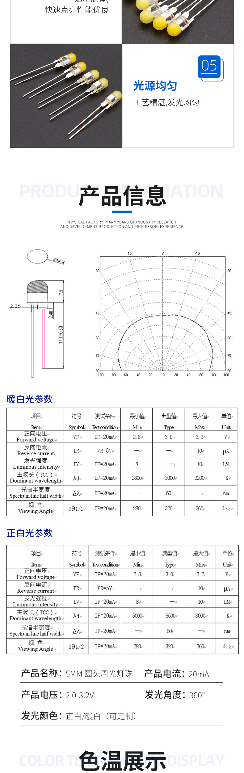 5мм круглая голова 0.5W 360° полноэмитирующий светодиод F5 теплый белый