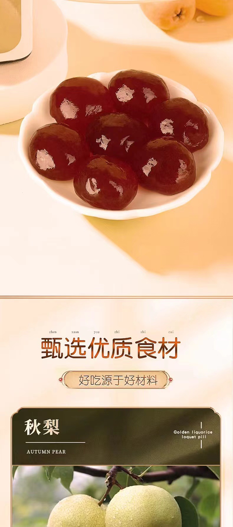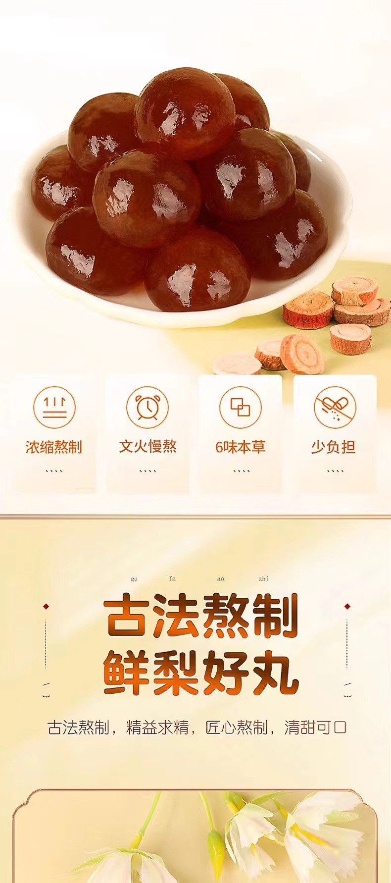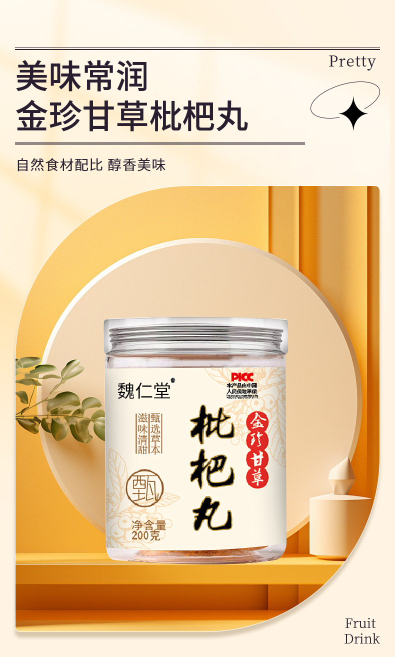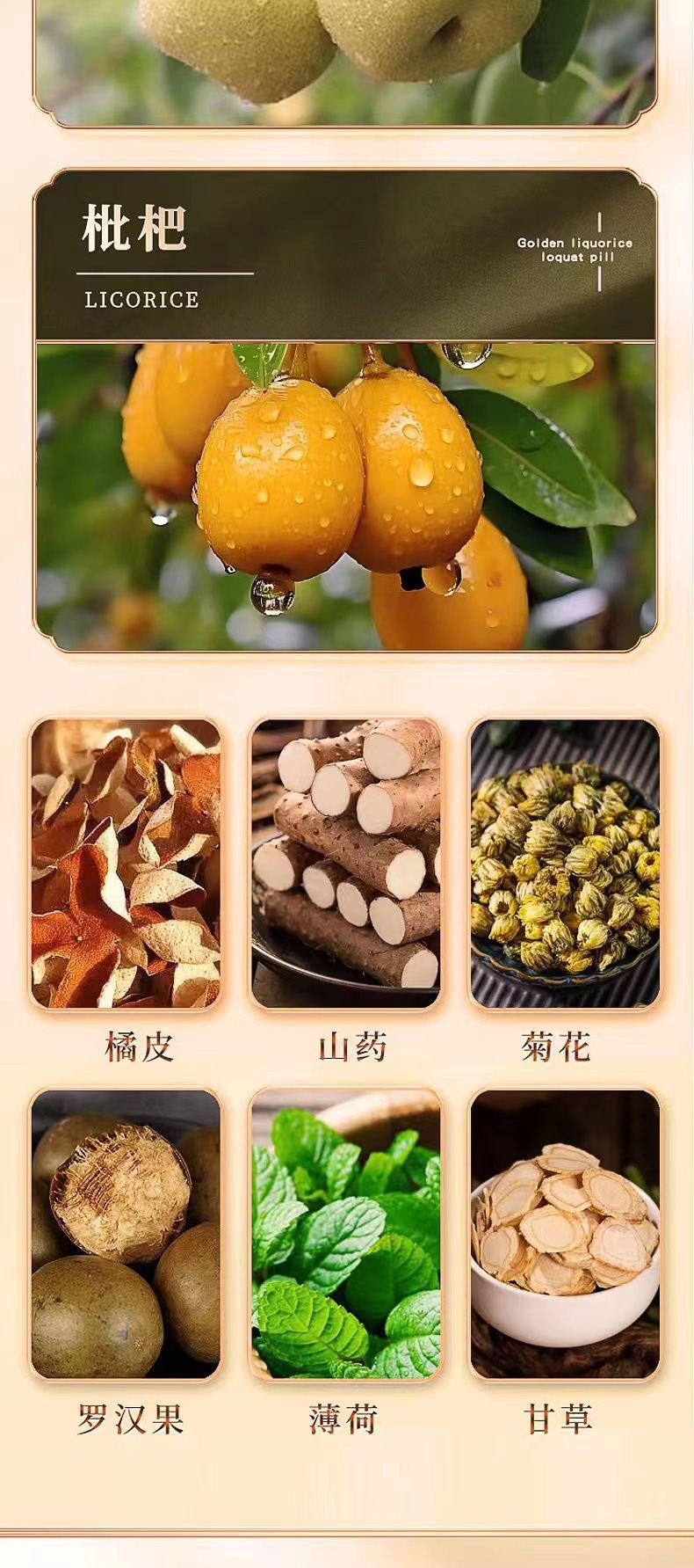 Основные сырьевые материалы Loquat, whole wheat flour, orange peel, yam, chrysanthemum, monk fruit, mint, licorice,