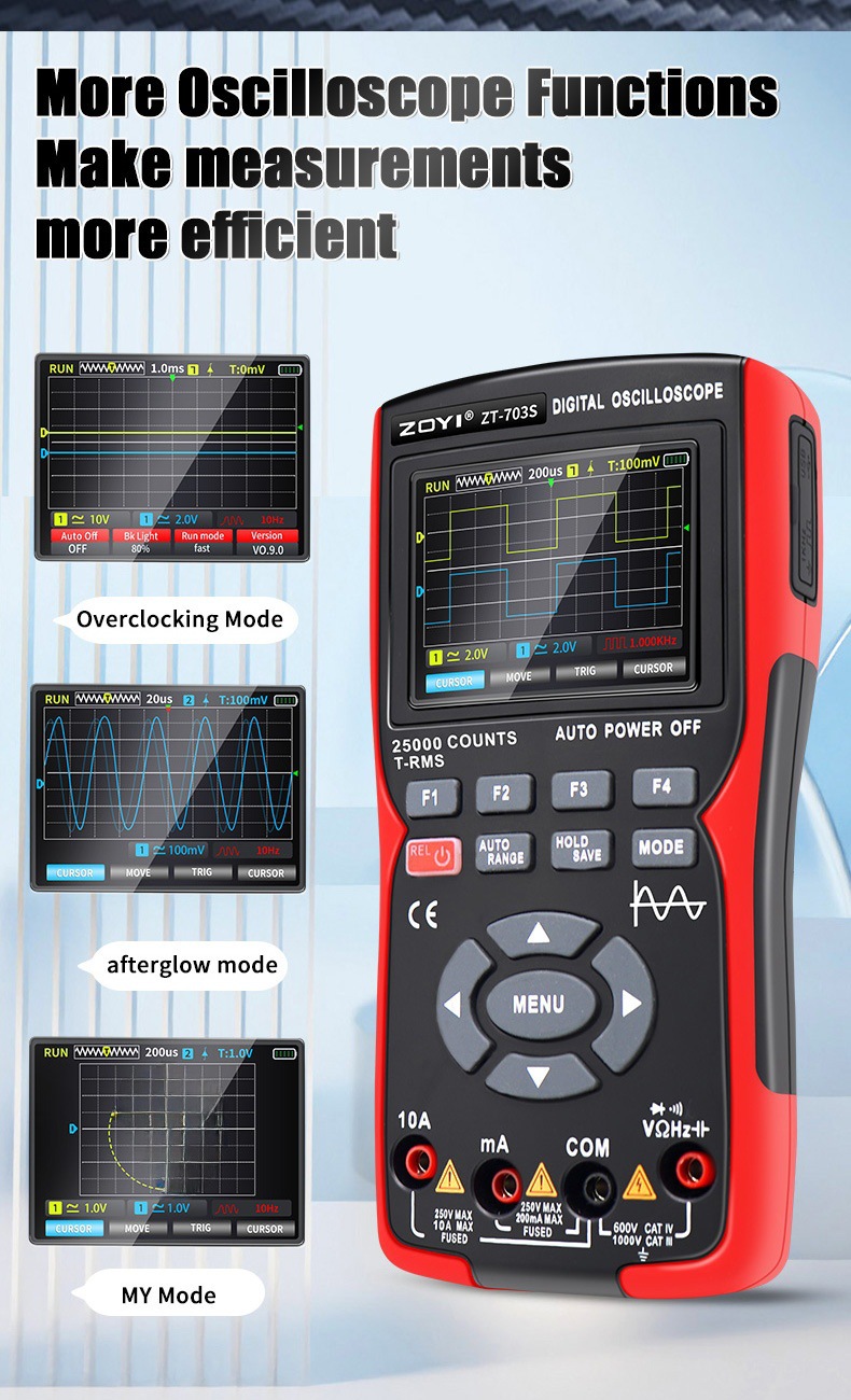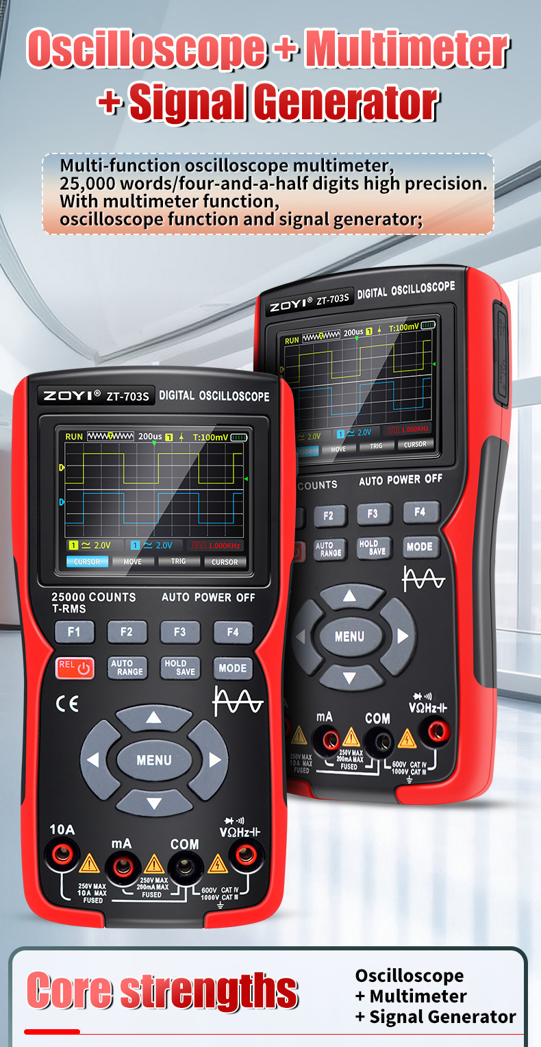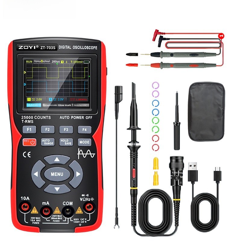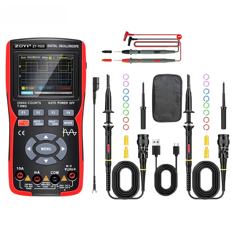 - Three-in-One Design:The ZT-703S multimeter is a three-in-one device, combining a high-precision oscilloscope, signal generator, and multimeter in one compact unit.