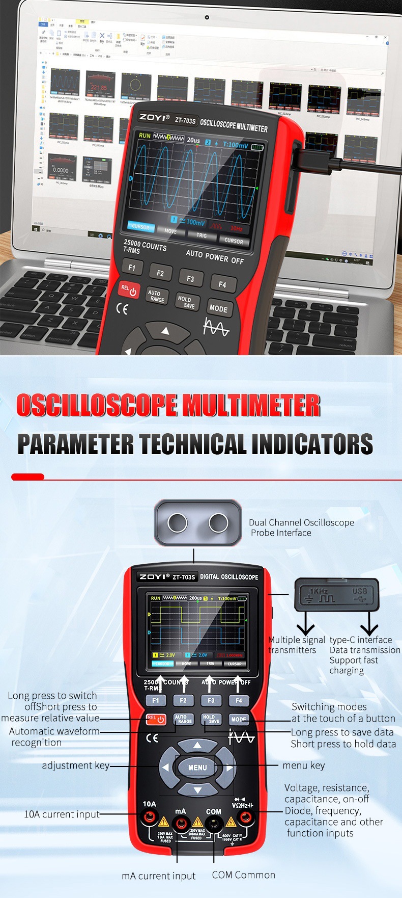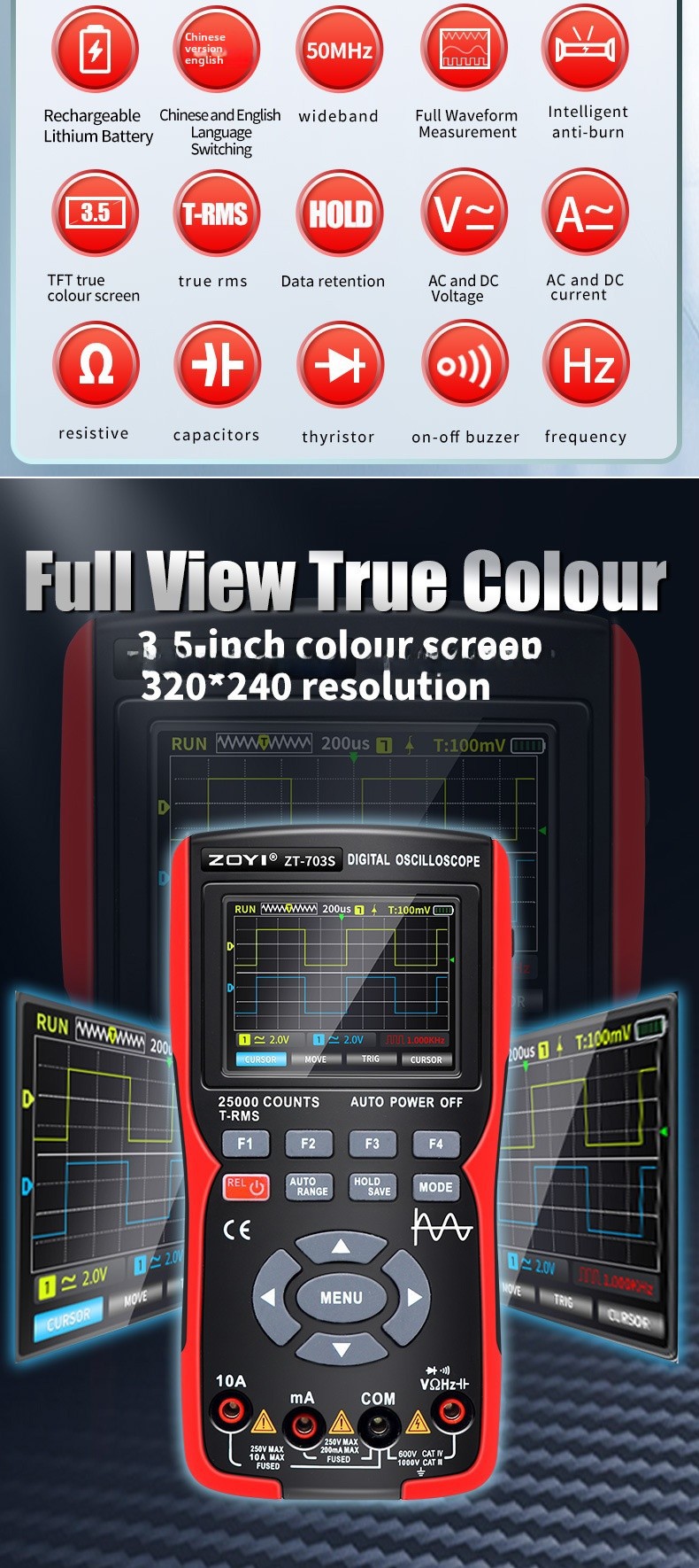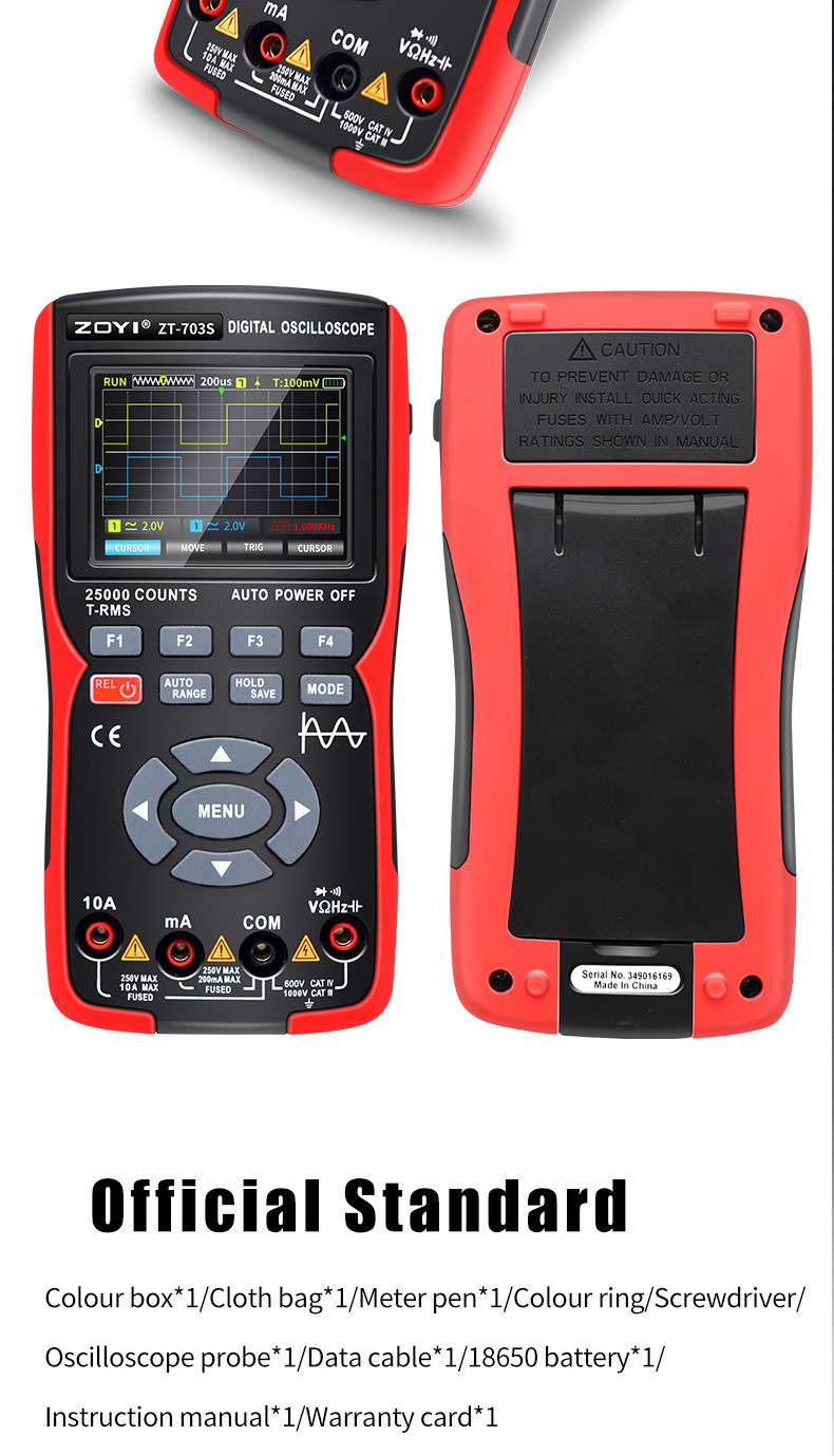 - Three-in-One Design:The ZT-703S multimeter is a three-in-one device, combining a high-precision oscilloscope, signal generator, and multimeter in one compact unit.