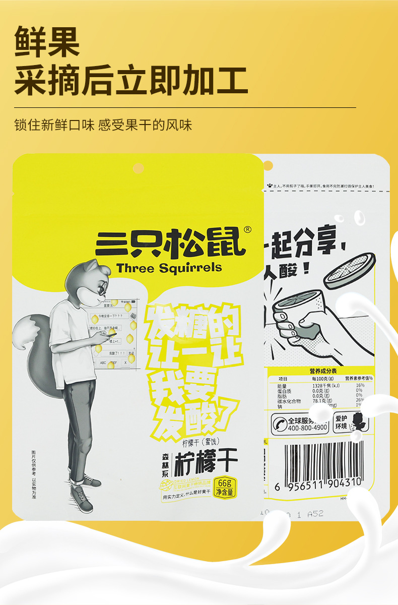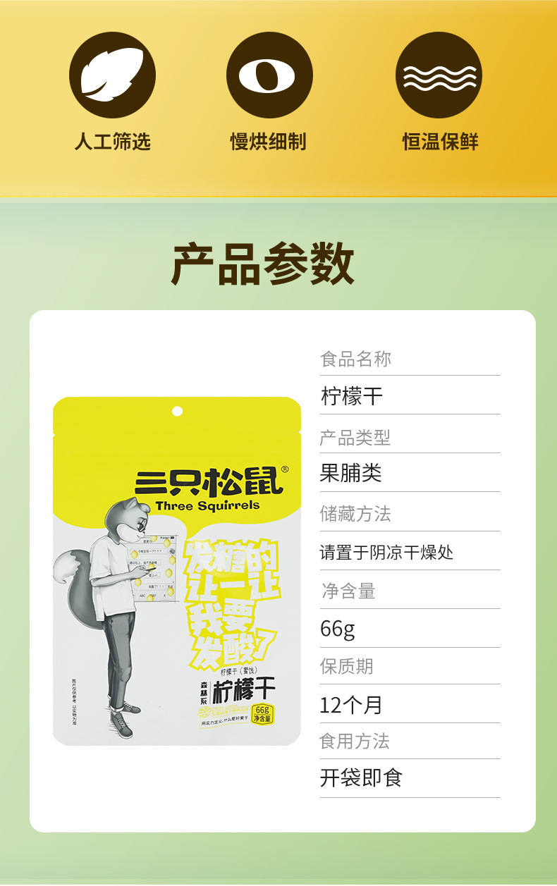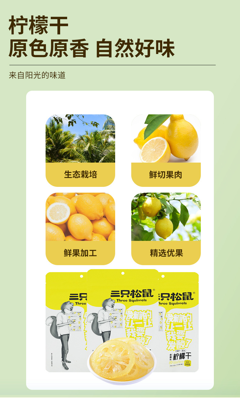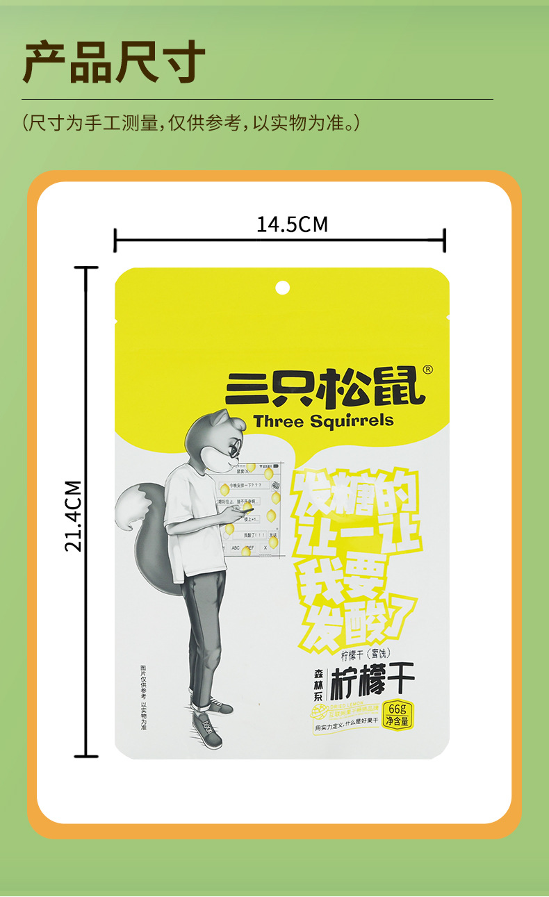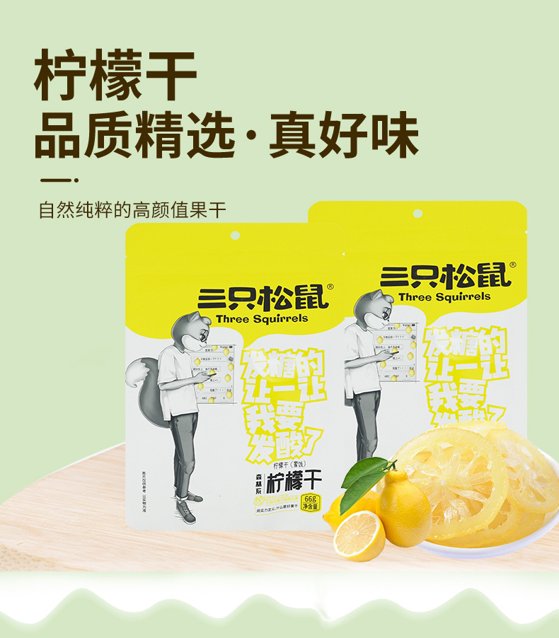 ![]() | Three squirrel dried lemon 66g | 1шт: ¥8.50 | 906 | 5274063960688 |
