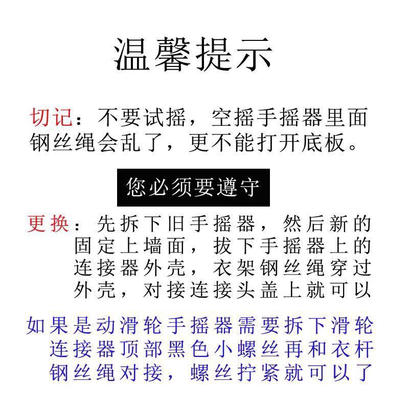 厂家直销晾衣架配件:手摇器、万向轮,顶盖 ,钢丝,杆子等,品质保证,价格实惠随着生活品质的提高,晾衣架配件作为家居生活中不可或缺的一部分,其品质和功能越来越受到人们的关注。为了满足广大消费者的需求,我们富阁尔作为专业的晾衣架配件生产厂家,直销各种优质的晾衣架配件,旨在为顾客提供更好的家居生活体验。一、手摇器:轻松升降,操作便捷我们的手摇器采用优质材料制作,具有良好的抗磨损、防腐蚀性能,经久耐用。其设计简洁大方,操作便捷,可轻松实现晾衣架的升降,让您轻松晾晒衣物。此外,我们的手摇器还配备了专用防滑卡黄,有效防止使用过程中打滑,增加使用安全性。二、万向轮:自由移动,方便省力我们的万向轮采用高品质的耐磨材料制成,具有出色的承重能力和灵活性,确保在使用过程中不会意外滑落。三、品质保证:严格品控,让您购买无忧我们对每一件产品都进行严格的品质检测和控制,确保每一件晾衣架配件都符合国家标准和用户需求。我们承诺为您提供品质卓越、性能稳定的晾衣架配件,让您购买无忧。四、价格实惠:物美价廉,让您轻松拥有品质生活我们直销各种晾衣架配件,省去了中间商环节,让您以更实惠的价格购买到高品质的产品。同时,我们还提供多种促销活动和定制服务,让您可以根据自身需求选择合适的晾衣架配件,轻松拥有品质生活。欢迎广大顾客前来抢购我们的晾衣架配件!我们将竭诚为您服务,让您享受到更美好的家居生活。