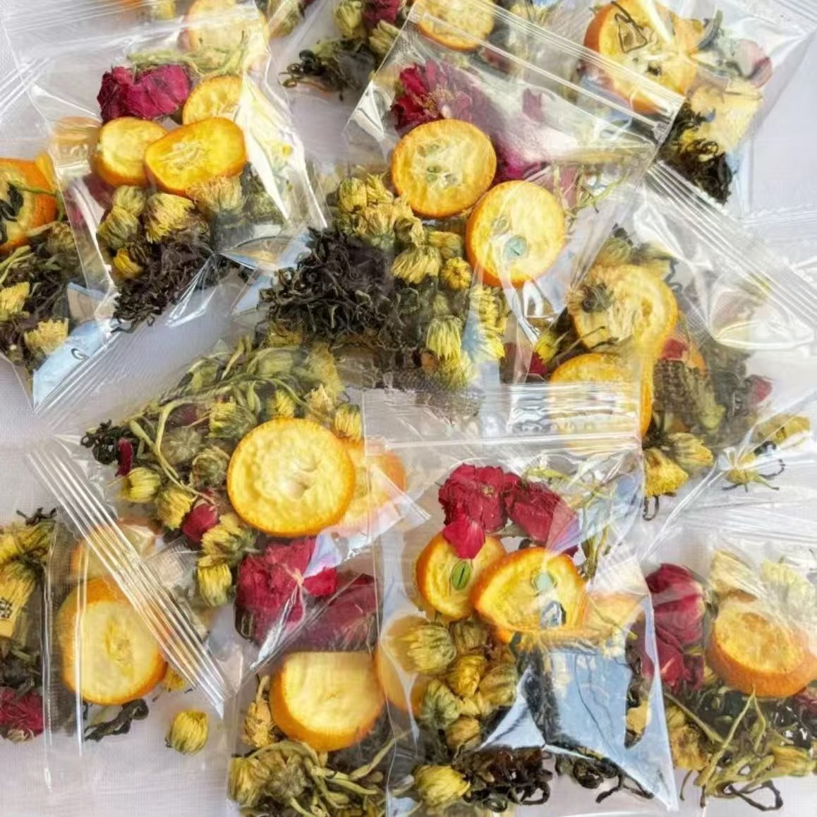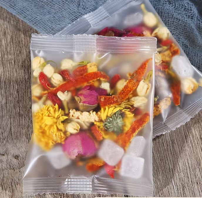 配料:冬瓜丁 荷叶 橘皮 决明子 重瓣红玫瑰 茯苓 金桔