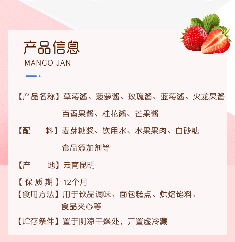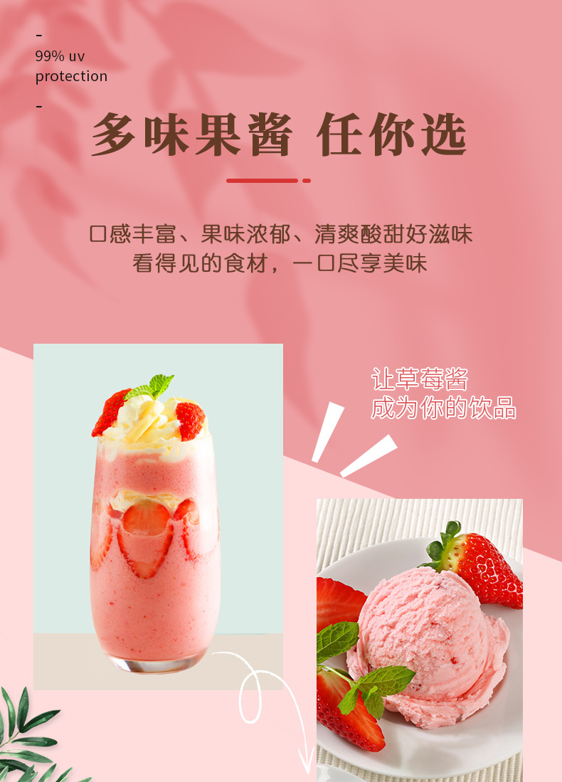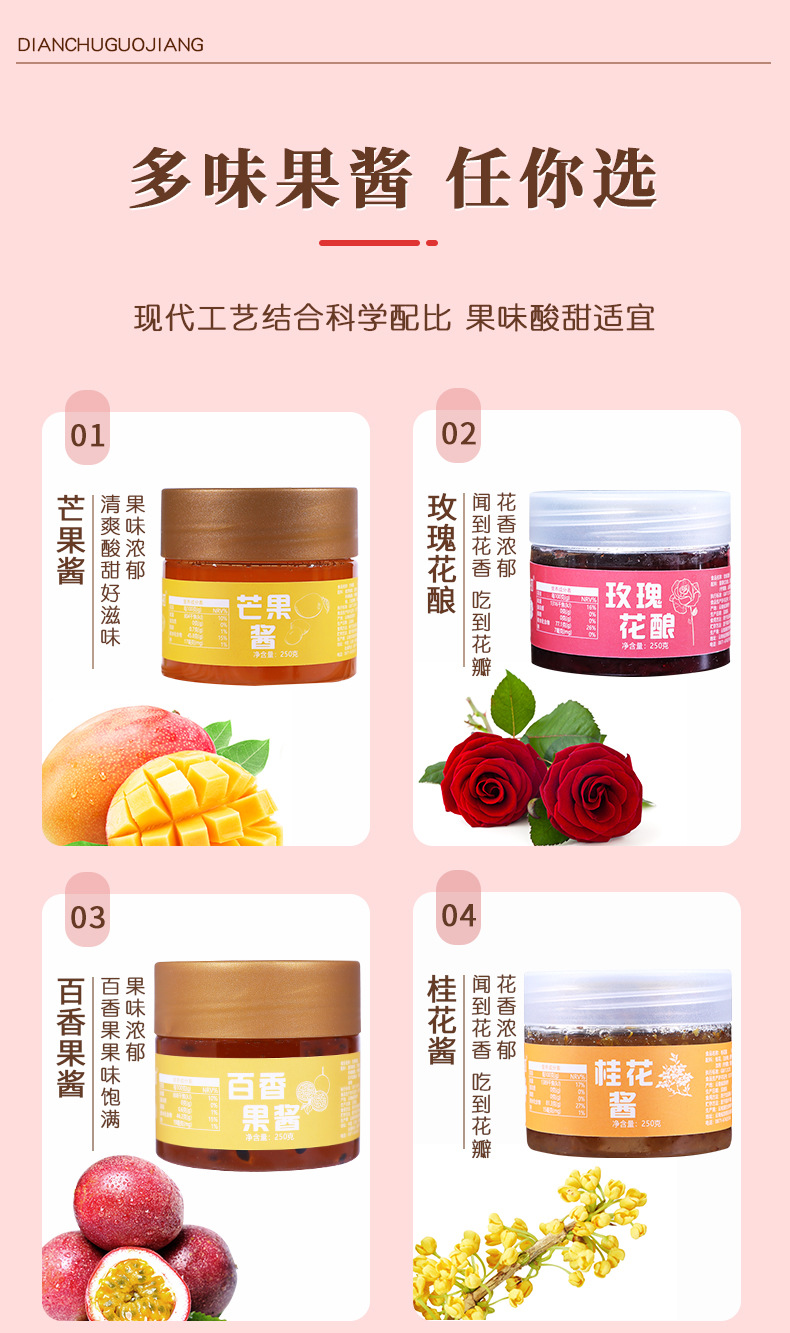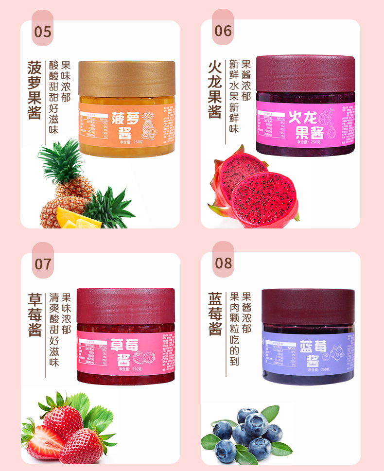 玫瑰酱 桂花酱 草莓酱 蓝莓酱 火龙果酱 百香果酱 菠萝酱 桑葚酱 芒果酱 果酱摆摊专用 果酱商用批发