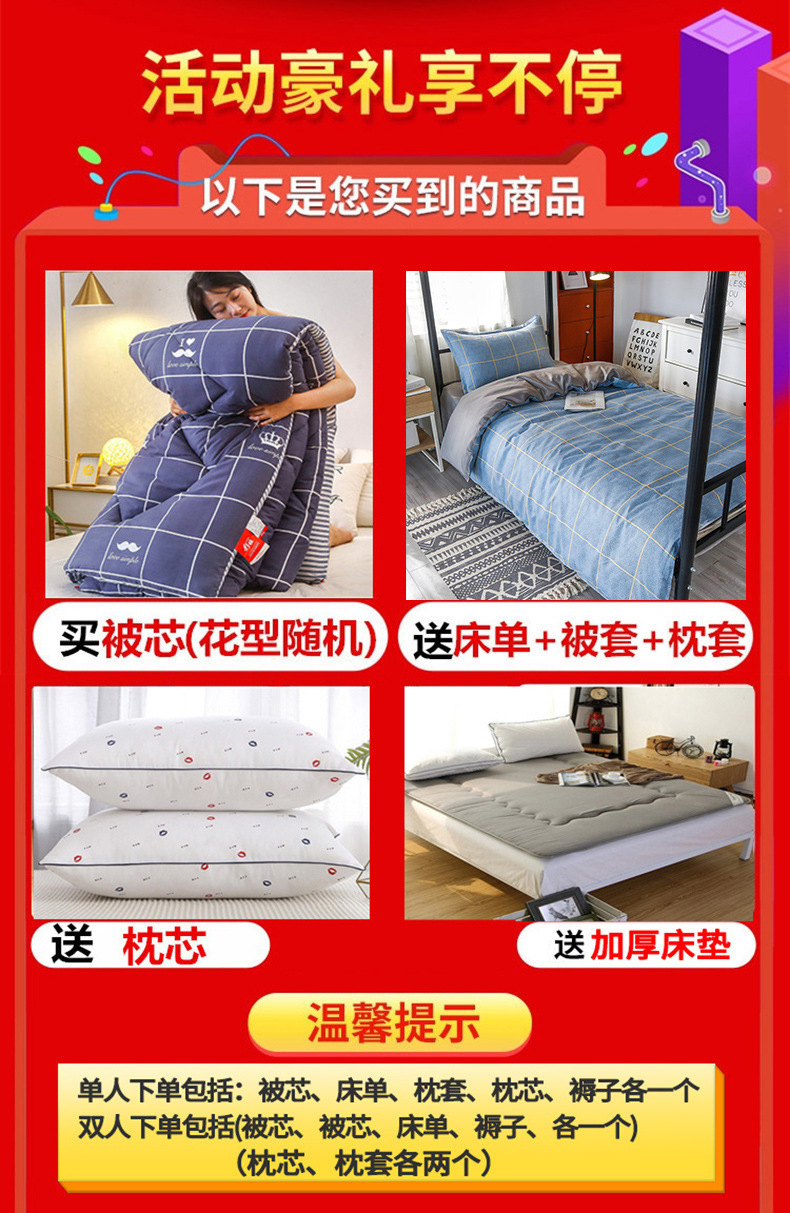 ![]() | Random color [no ball does not fade]] | 0.9m bed six-piece set (bed sheet quilt cover pillowcase 5kg pillow core mattress) six-piece set | ¥93.9 / ≈ 1 133 ₽ | 99793676 | 5331506376176 | |