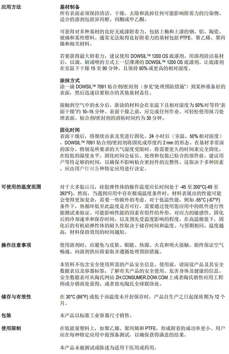 ·预处理:所有表面必须保持清洁、干燥。去除和洗掉任何可能影响附着力的污染物。适合的溶剂包括异丙醇、丙酮或甲乙酮。若要获得最大附着力,建议使用DOWSIL™1200OS底漆剂。用溶剂清洁基材后,以滴、刷或喷的方式上一层薄薄的DOWSIL™1200OS底漆剂。让底漆剂在室温下干燥15至90分钟,且保持50%或更高的相对湿度。 ·施胶:取适量本品均匀涂覆在待粘接表面。接触到空气中的水分后,新涂的材料会在室温下且相对湿度为50%时等待“表面干燥”约10–15分钟。表面干燥之前,应完成任何作业。可轻松使用抹刀处理表面。粘合剂/密封剂的消粘时间约为30分钟。 ·固化:表面干燥后,将继续由表及里进行固化。24小时后(室温、50%相对湿度),DOWSIL™7091粘合剂/密封剂将固化成厚度约2mm的形态。在基材非常深的部分,特别是所要求的大气湿度受限时,将需要更久的时间来完全固化。在较低的湿度水平,固化时间会延长。处理和包装已粘合的部件前,建议用户等待足够的时间,以确保不影响粘合密封件的完整性。这取决于多种因素,应由用户针对各种特定应用进行决定。