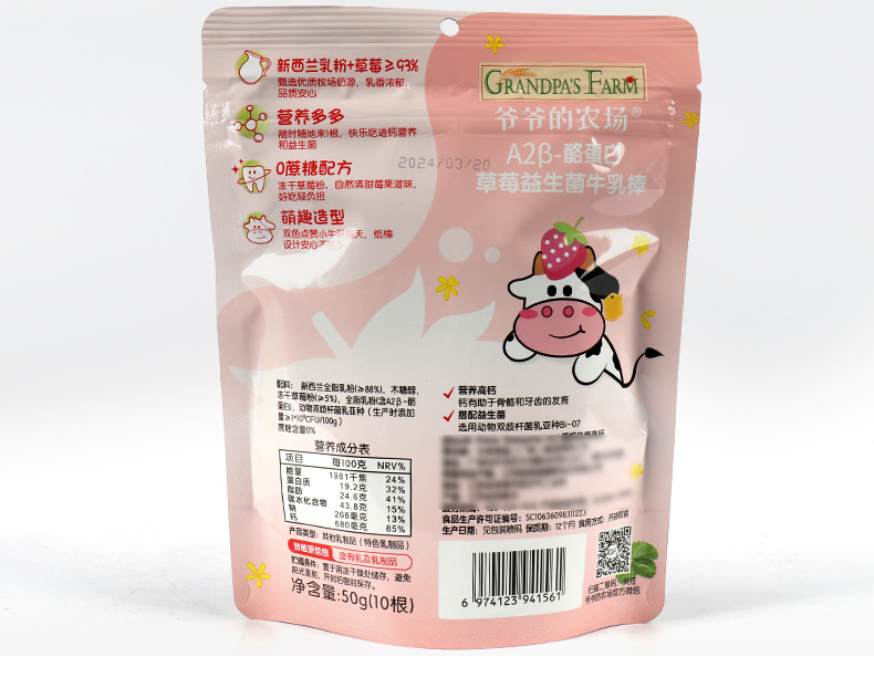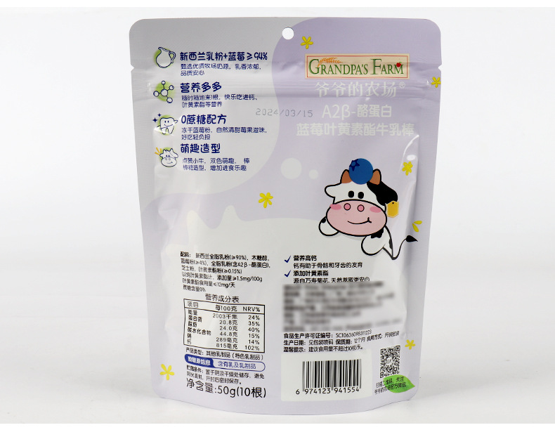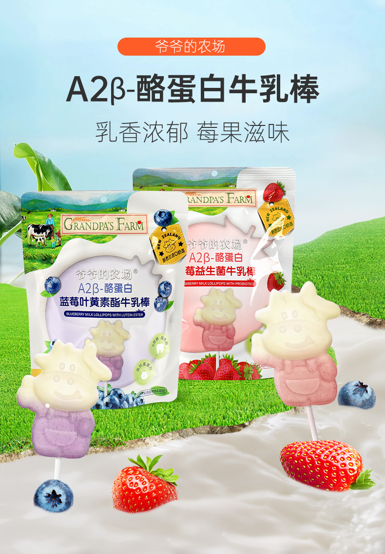 Молочный батончик A2 бета-казеина от деда, 50г, клубничный пробиотик, черника, лютеин, молочный леденец
