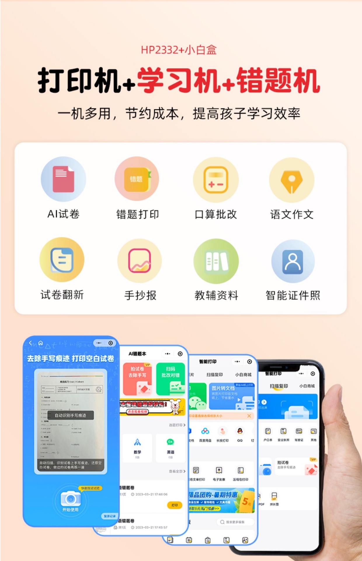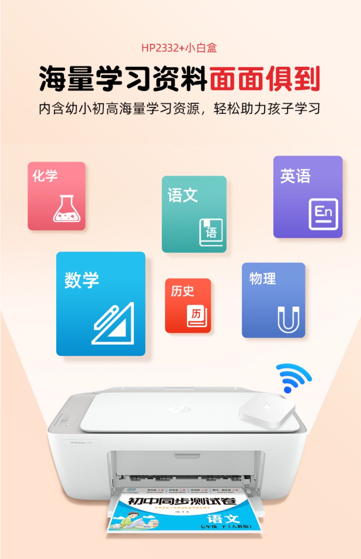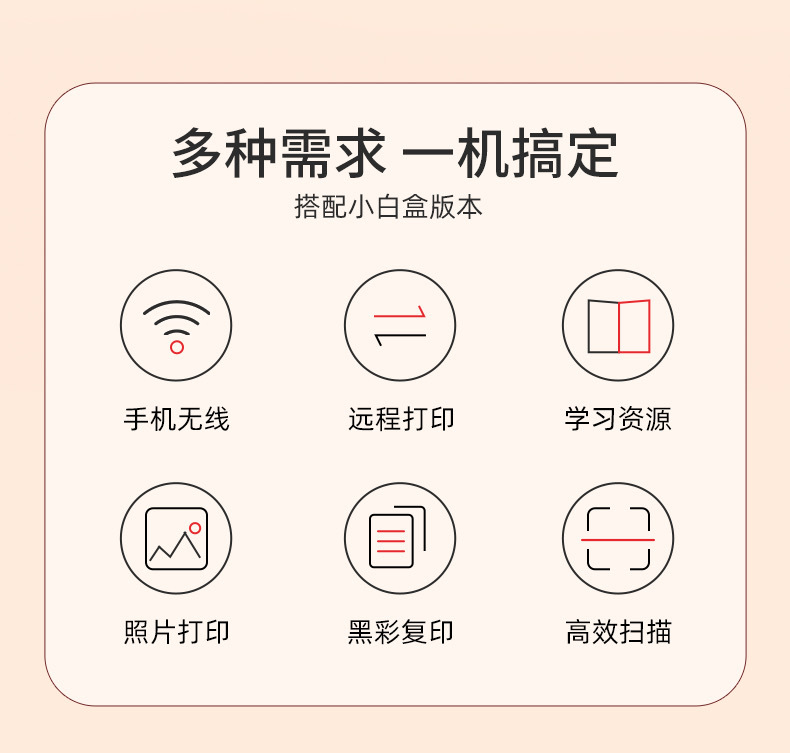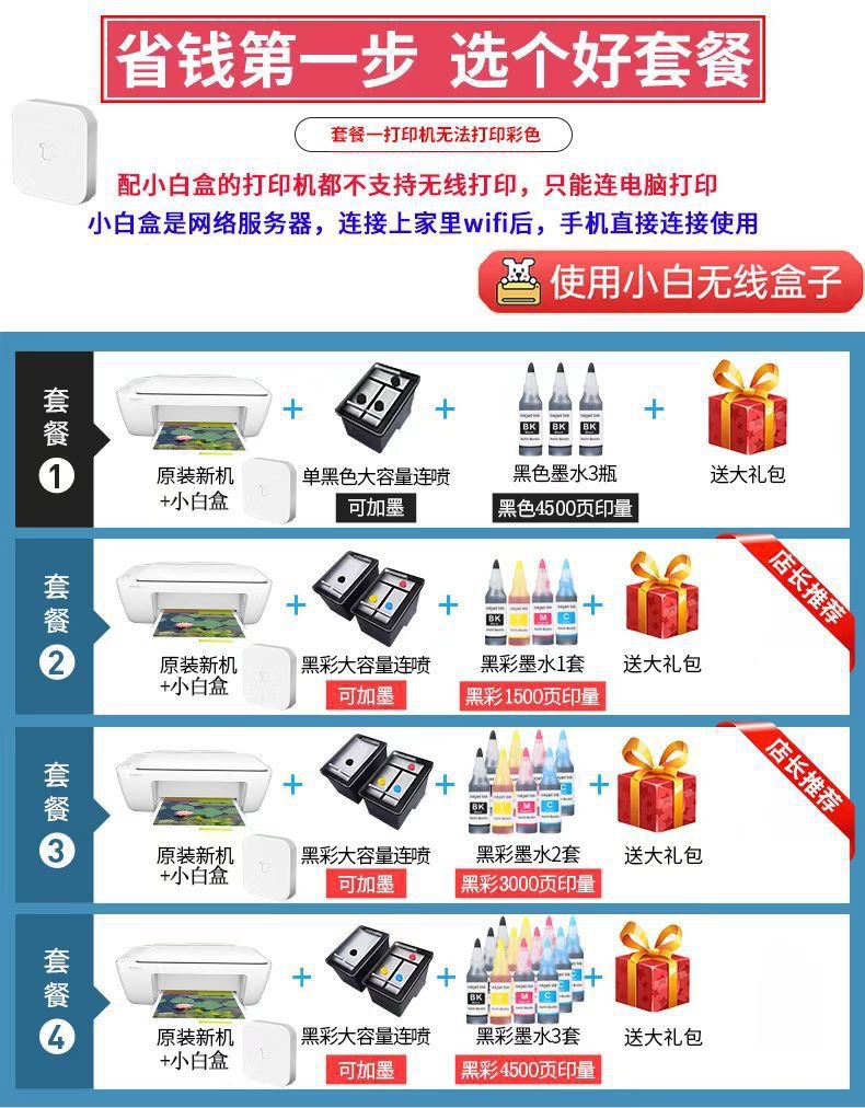 声明:本店所出售的机器(包括所有配件)100%原装全新正品,此款打印机支持打印,复印,扫描,搭配小白学习盒子可以wifi手机连接打印,海量学习打印资源!套餐配备大容量易加墨墨盒,可循环加墨,降低打印成本。长期使用更划算哦!当天六点前下单,当天发货,快递包邮到家