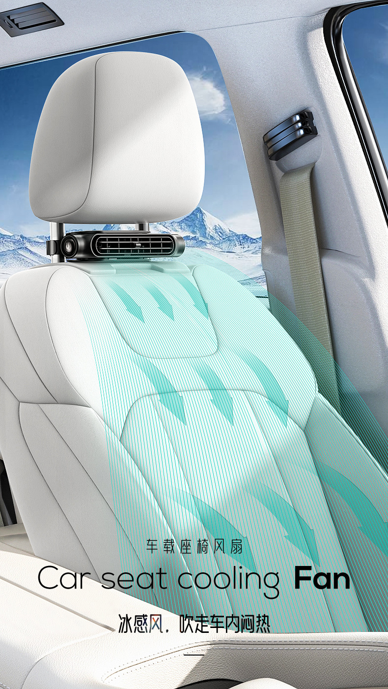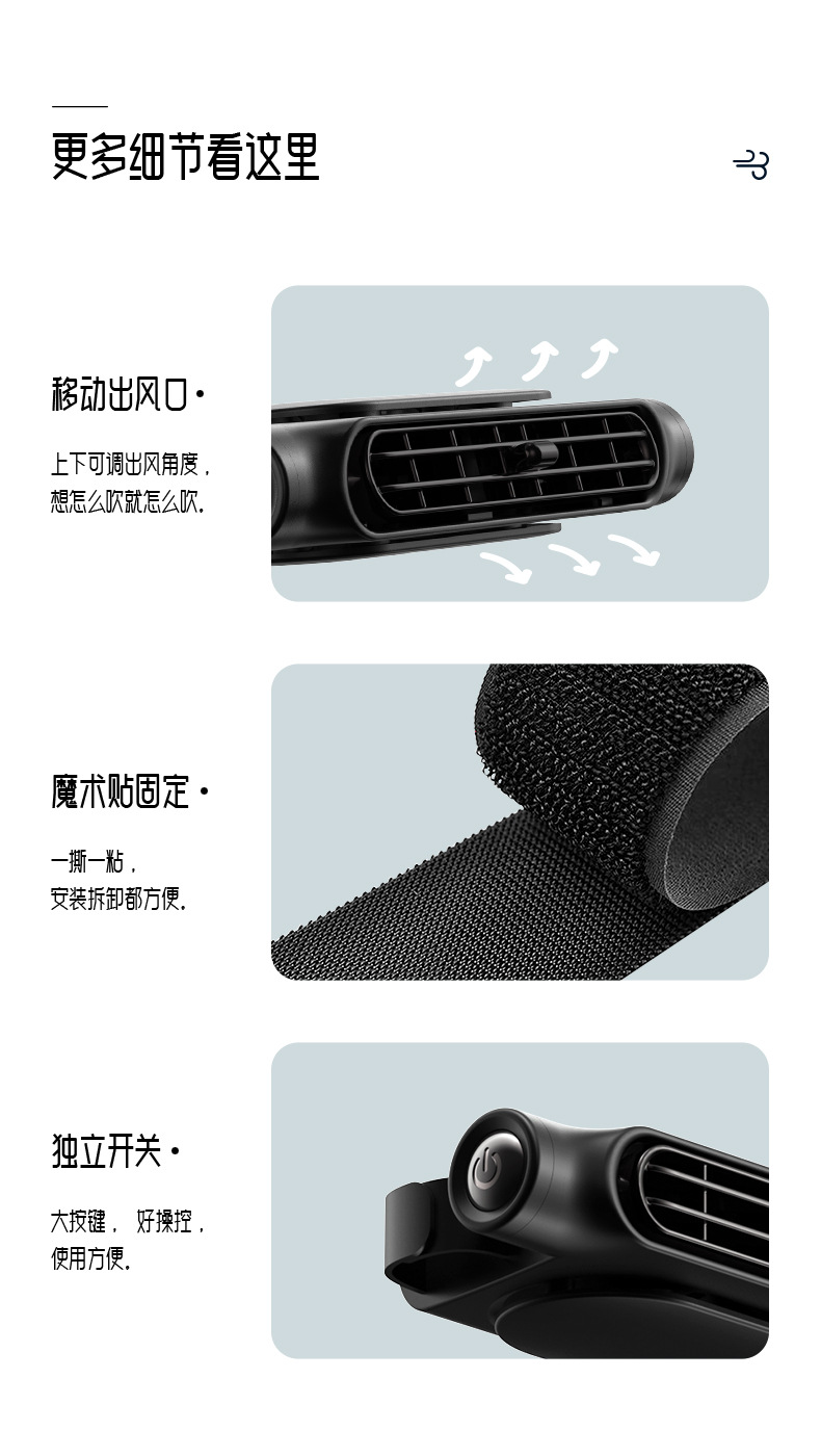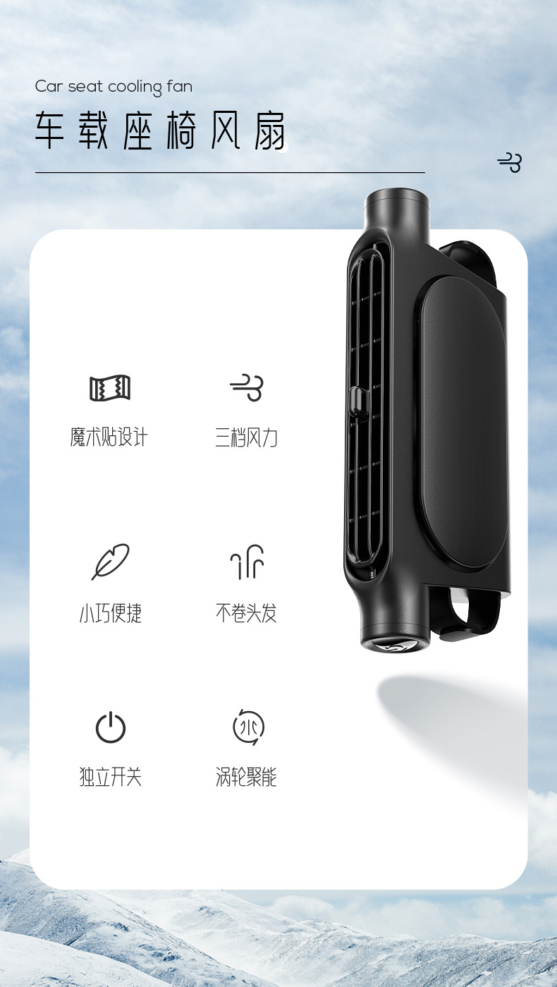 产品使用魔术贴两边固定的设计,让产品在使用过程不颠簸移动;在汽车座椅靠背合适的位置上,粘上魔术贴固定,通电后按开关键即可使用。