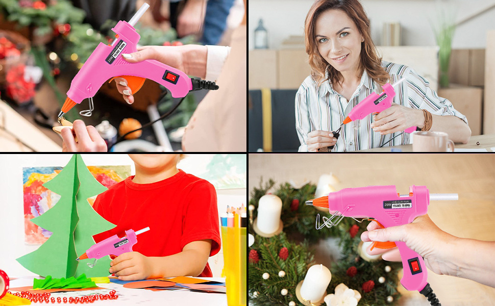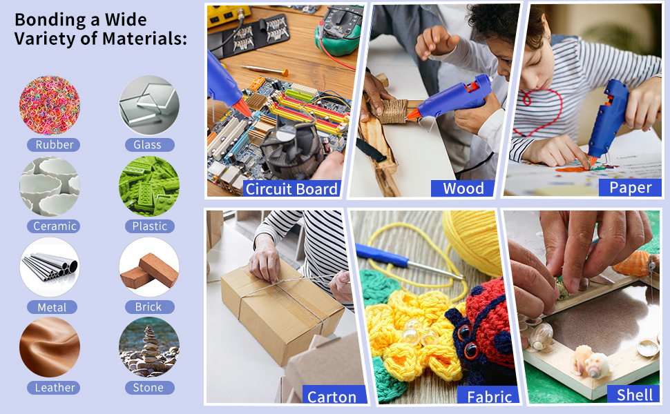 - (产品特点):我们的热胶枪套件非常适合 DIY 工艺品和艺术。适用于布料、木材、塑料、玻璃、石材、陶瓷、砖、纸、柳条、花边、棉花、布料和许多其他材料。