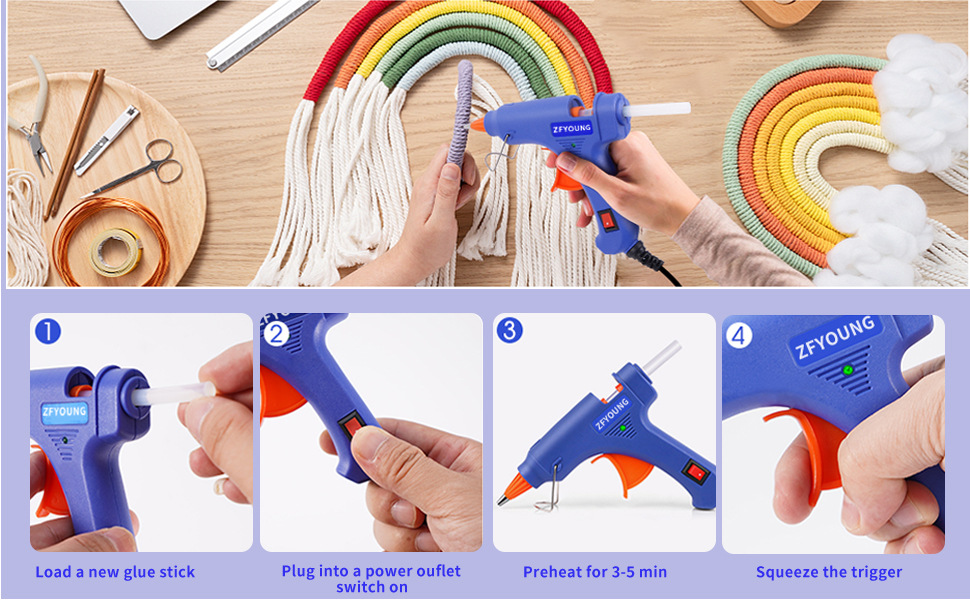 - (产品尺寸):20W蓝色热胶枪,采用7mm胶棒,使用安全稳定。我们的热胶枪的快速加热时间为 3-5 分钟,非常适合日常快速维修和装饰创意。