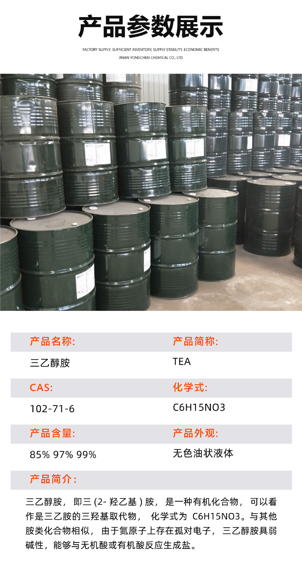 ![[Minimum Sale Price: 500g] Triethanolamine (Tea) Cement Grinding Aid, Commodity Grade 85%, Industrial Grade 97% Triethanolamine](/api/image?url=https%3A%2F%2Fcbu01.alicdn.com%2Fimg%2Fibank%2FO1CN01YWMDps1GgfHpQYIsw_!!3300000652-0-cib.jpg)