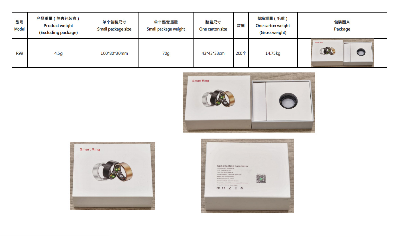 Список упаковки 1: smart ring*charging cable*instruction manual 2: smart ring*charging cable*charging compartment*instruction manual