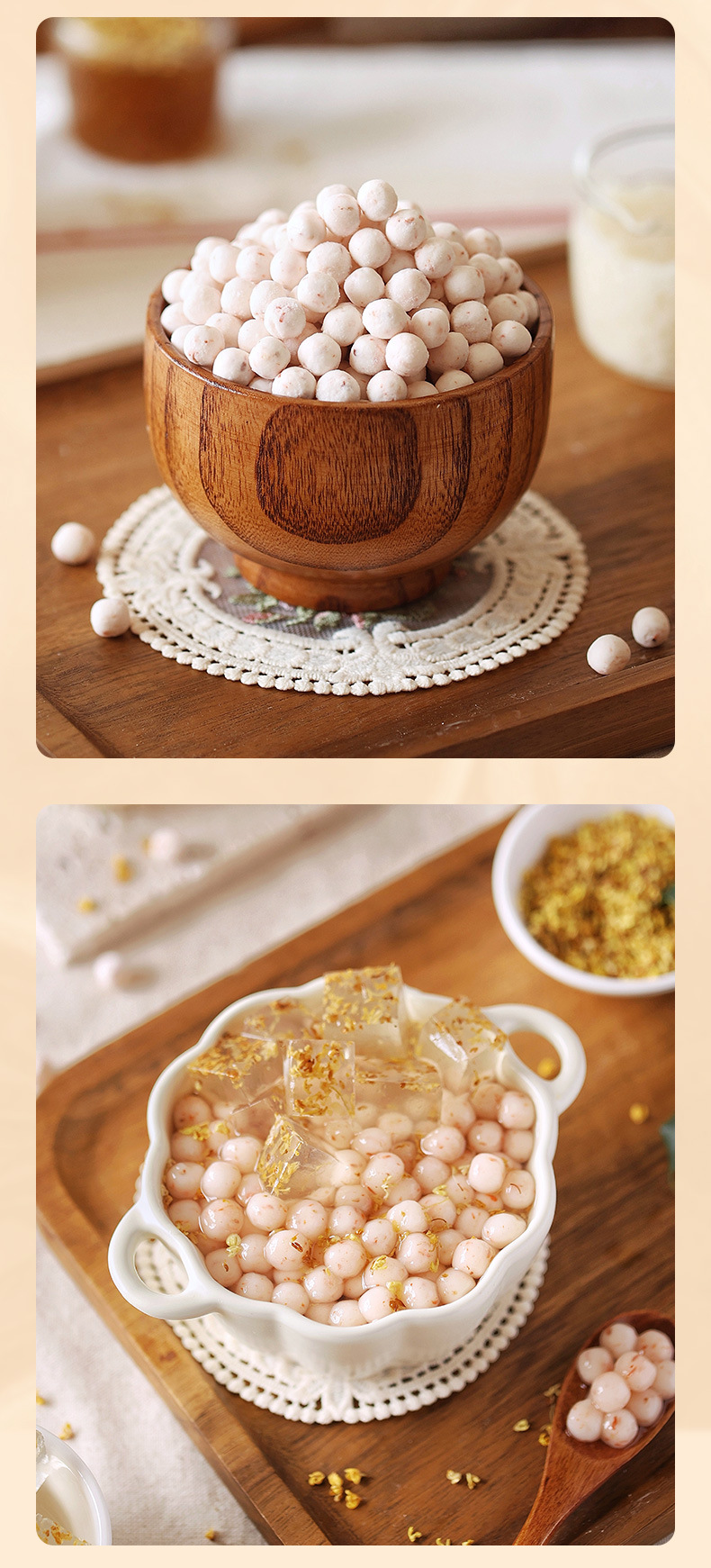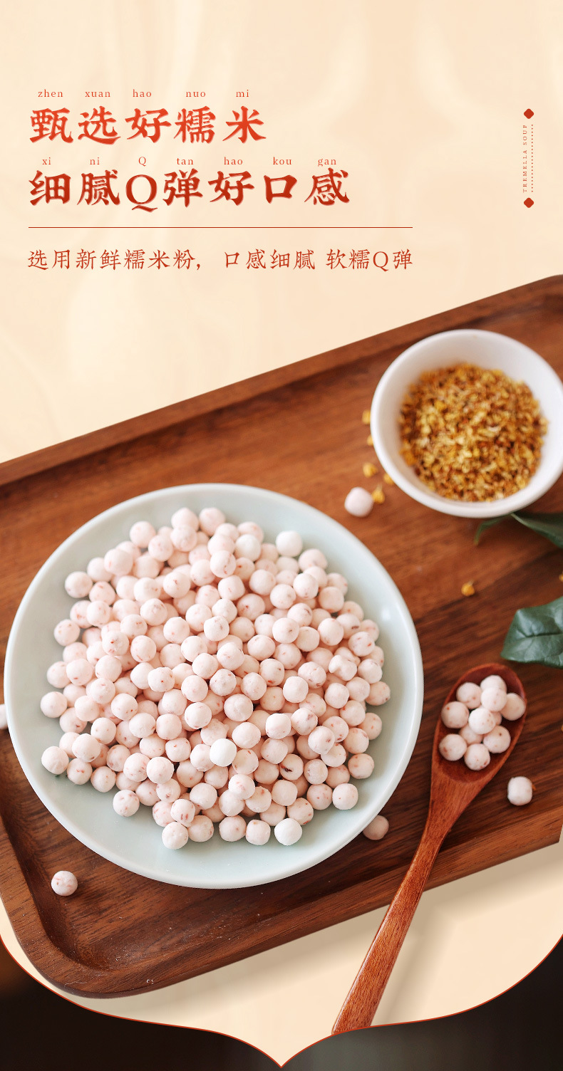 Сырьё и ингредиенты Glutinous rice flour, water, potato starch, honey osmanthus, hydroxypropyl starch, white sugar