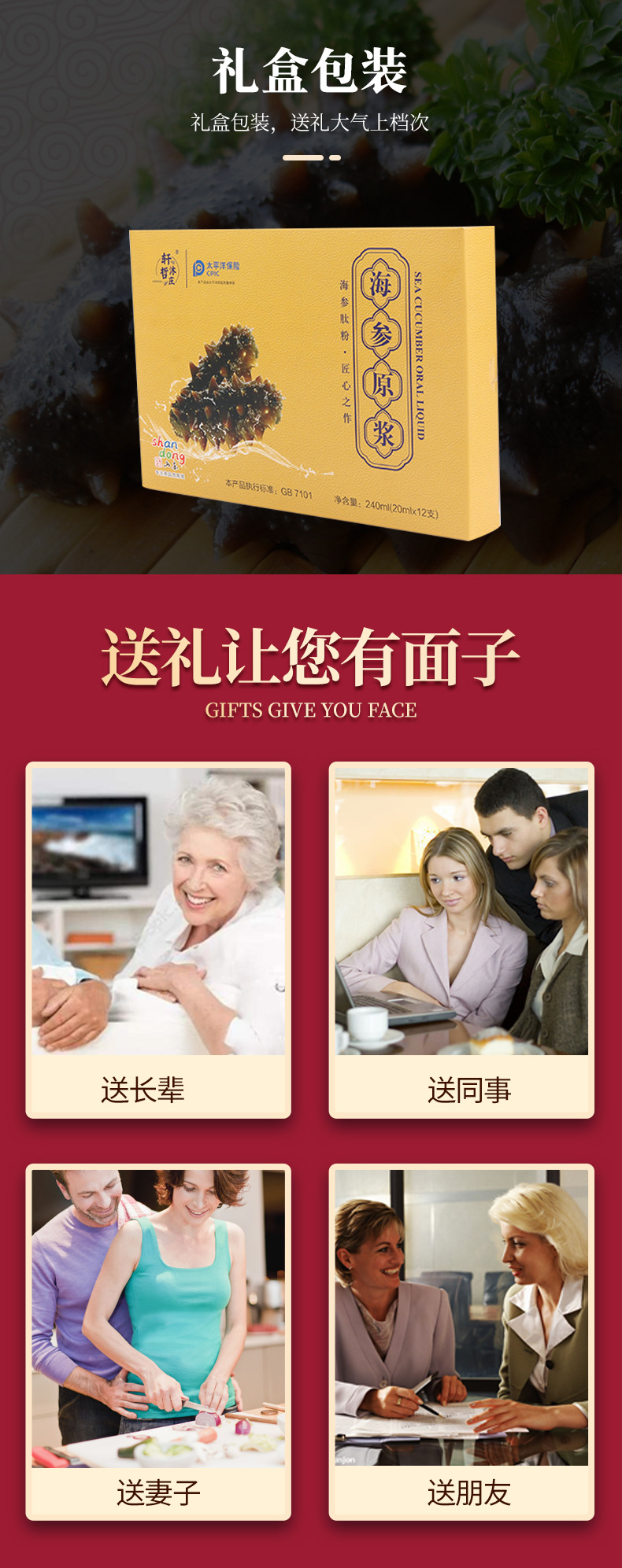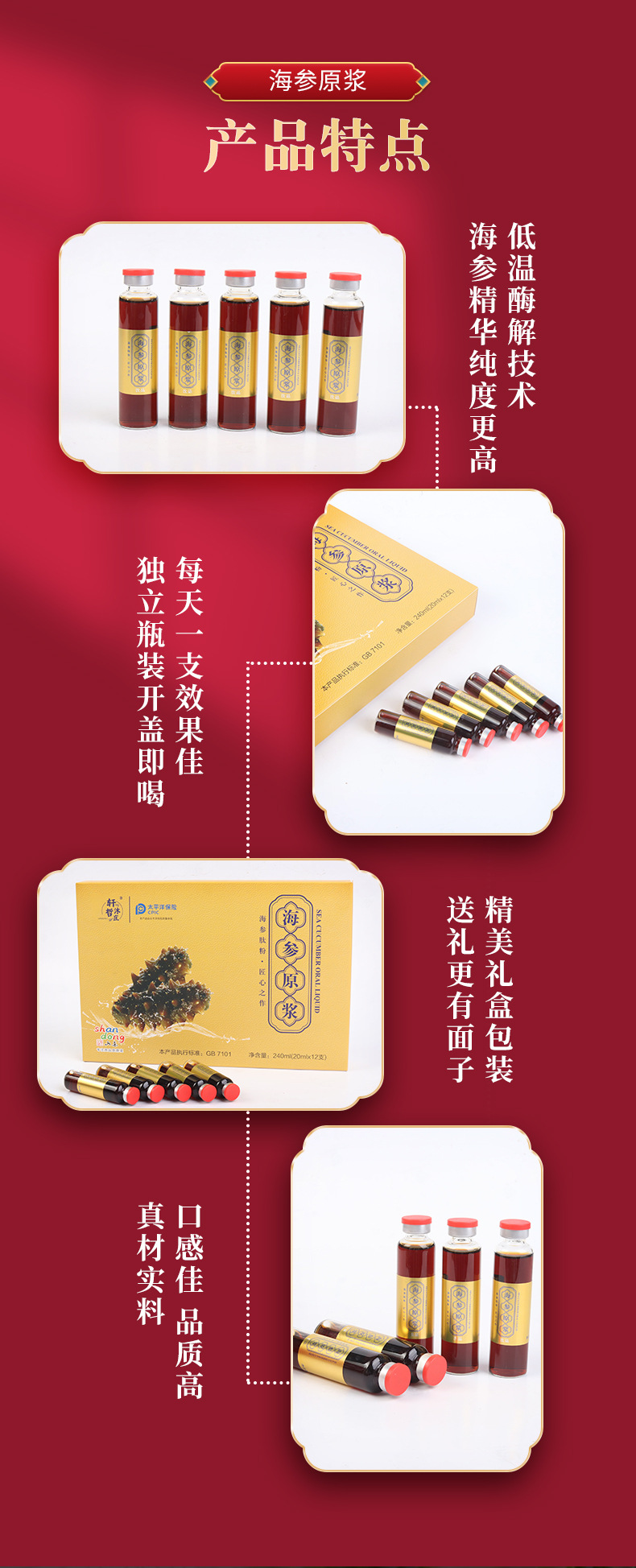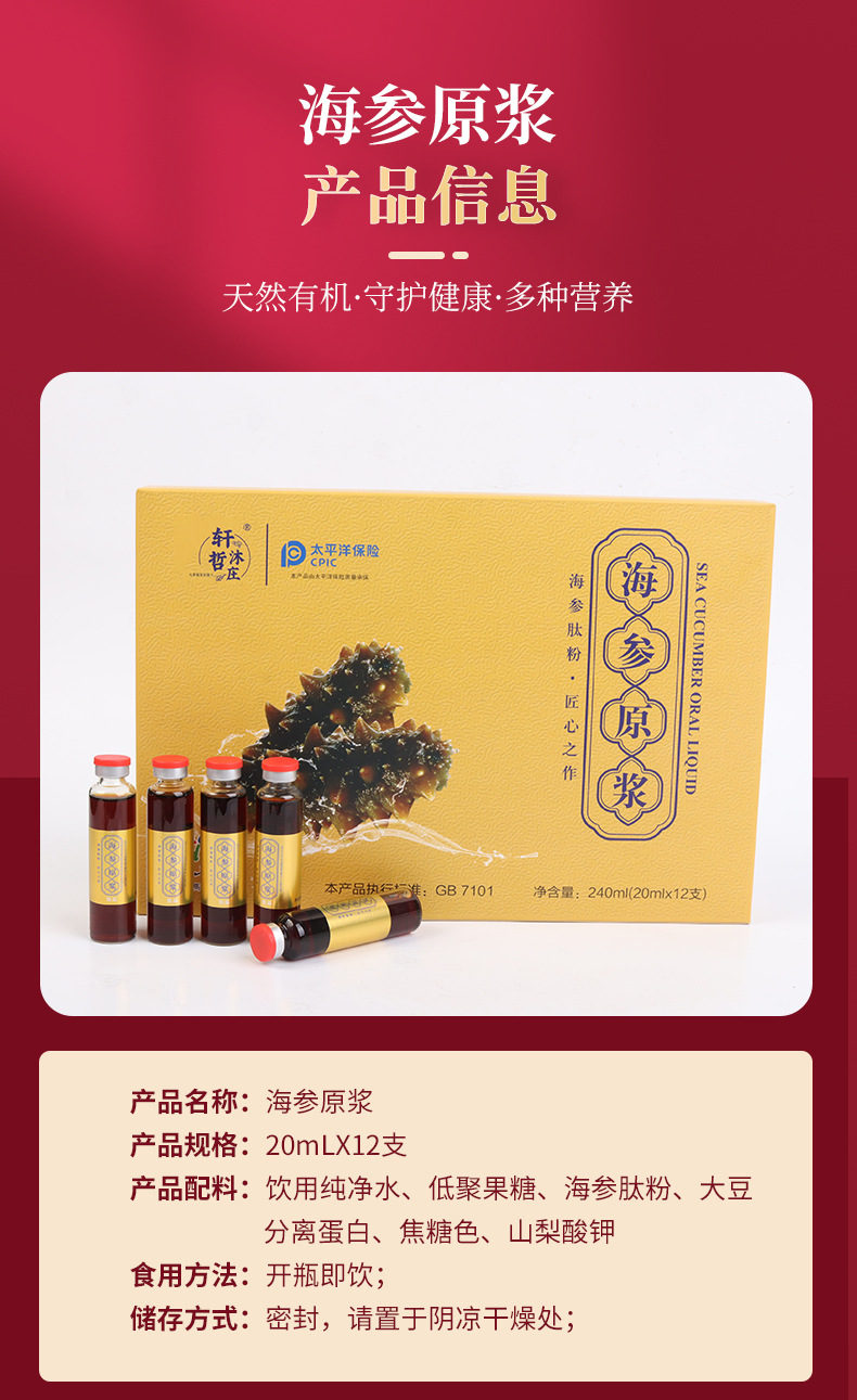 Основные сырьевые материалы Drinking purified water, fructooligosaccharides, sea cucumber peptide powder, soy protein isolate, caramel color, potassium sorbate