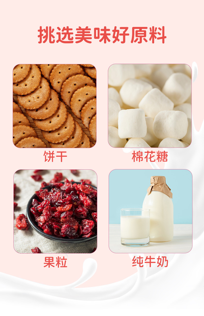 Сырьё и ингредиенты Milk food base powder (glucose syrup, refined coconut oil, all milk powder, gardenia yellow), biscuits, marshmallows, whole milk powder, fresh milk (pasteurized milk)
