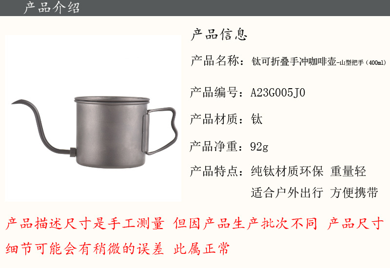 ![]() | Gable Handle | Pure titanium coffee hand brewing pot 400ml (spout removable) | 5шт: ¥79.00, 1000шт: ¥75.00, 2000шт: ¥72.00 | 40 | 5739856164884 | |