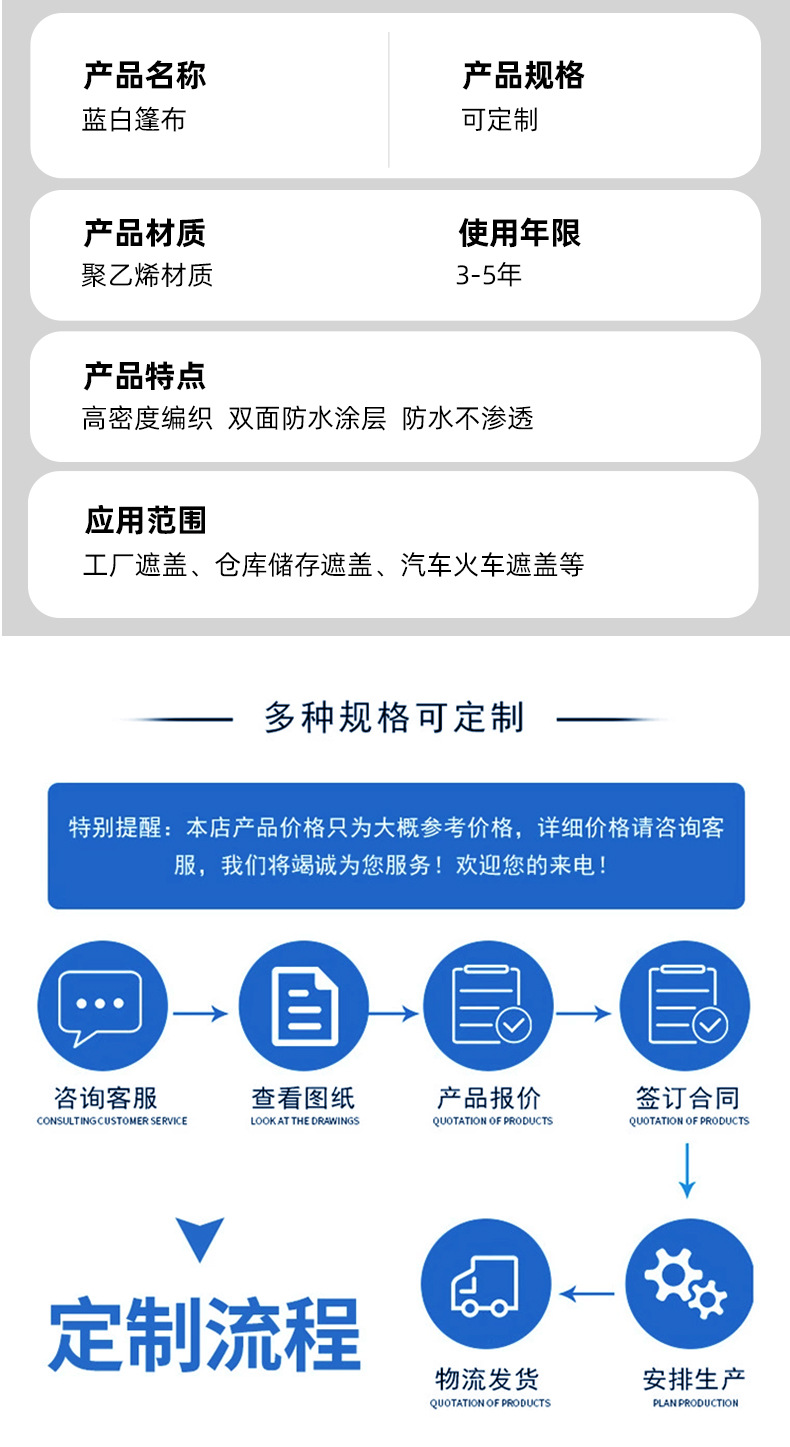 Оптовая продажа брезента синий и белый, водоотталкивающий, солнцезащитный, износостойкий, антивозрастной, промышленный, ткань для покрытия двора, пластиковый брезент, индивидуальный