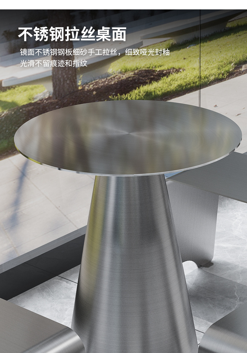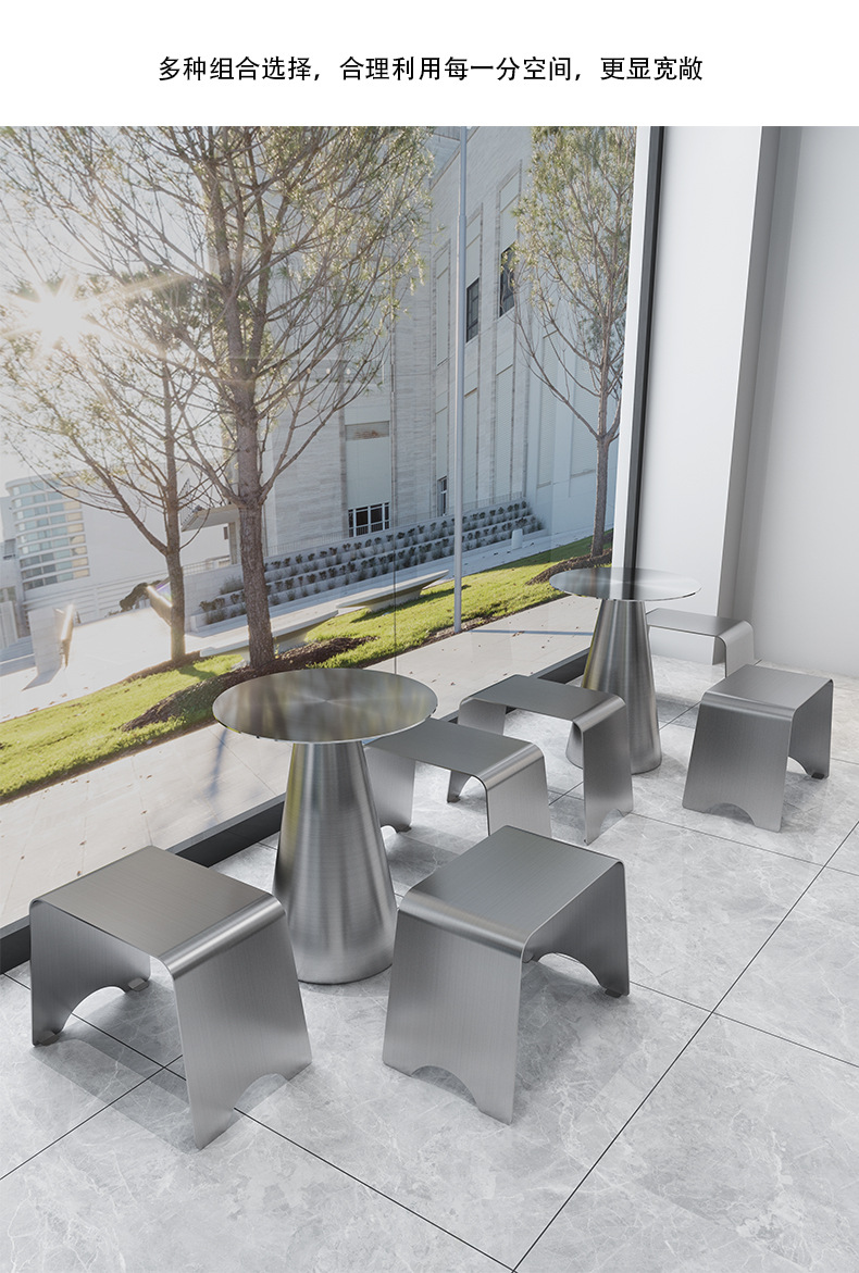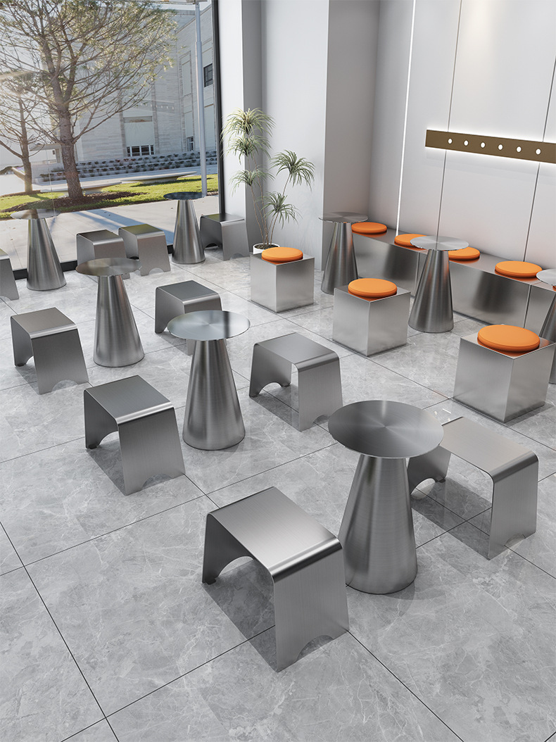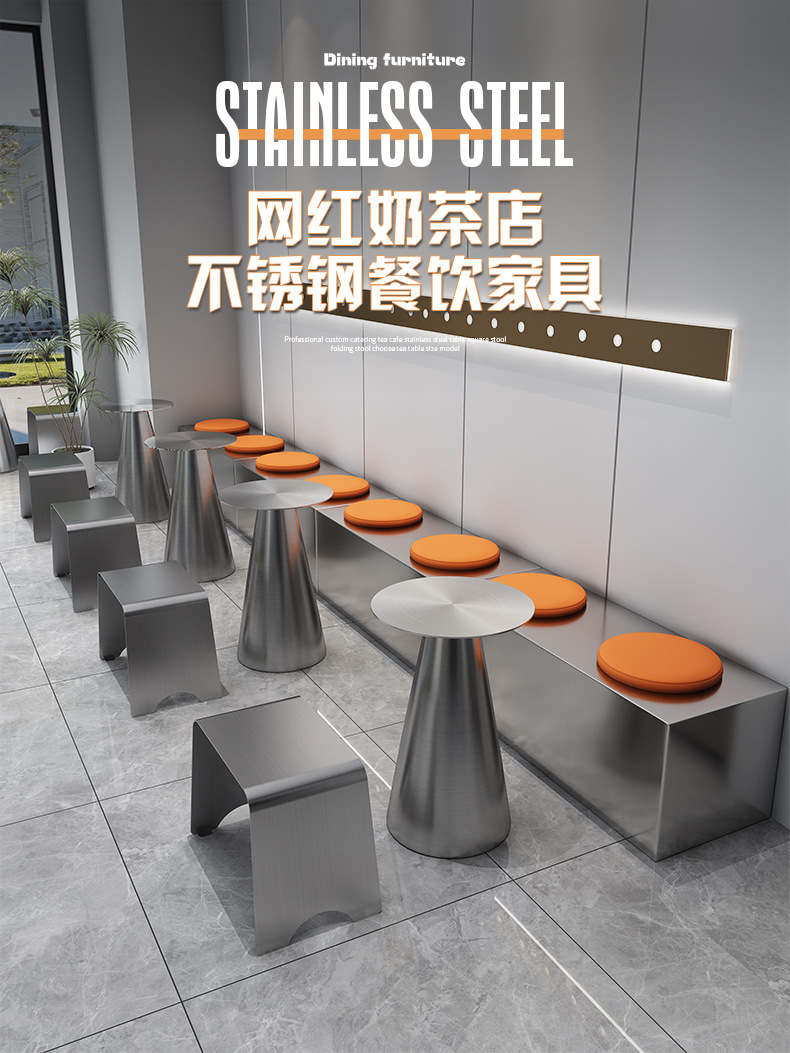 Стильный обеденный стол и стулья для чайного магазина, индустриальный стиль, простой круглый стол из нержавеющей стали, легкий люксовый барный прилавок, металлическое серебряное длинное место для сидения