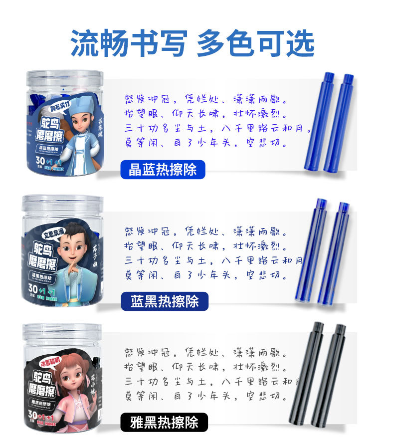 📦 | Hot erasable blue and black ink bags (30 pieces + pen moisturizer + eraser)/barrel | 720шт: ¥0.18, 5760шт: ¥0.17, 57600шт: ¥0.16 | 947367 | 5765031446495 | |