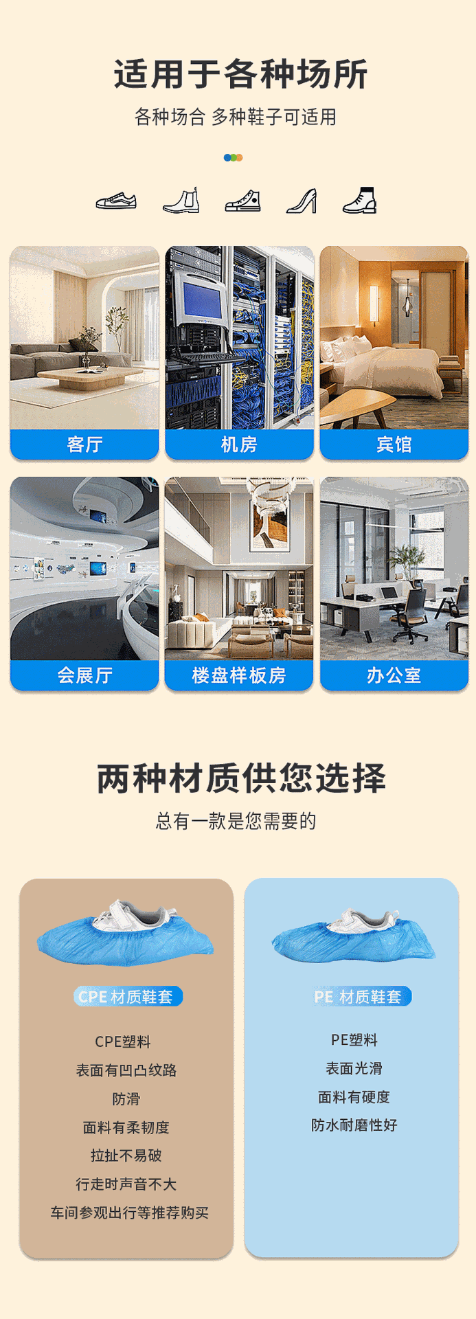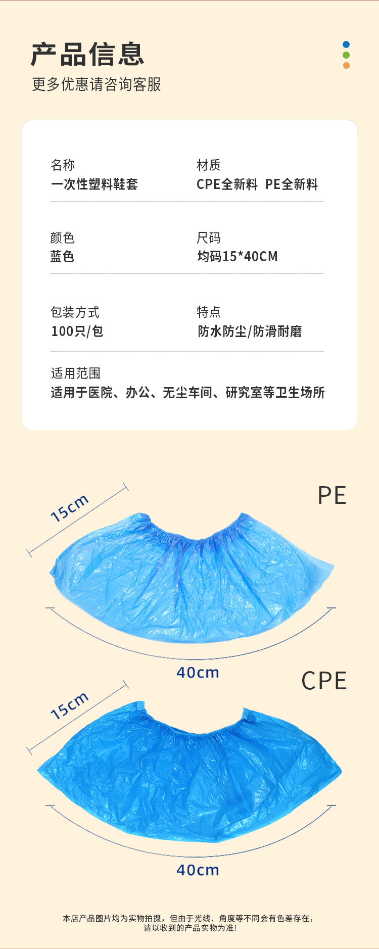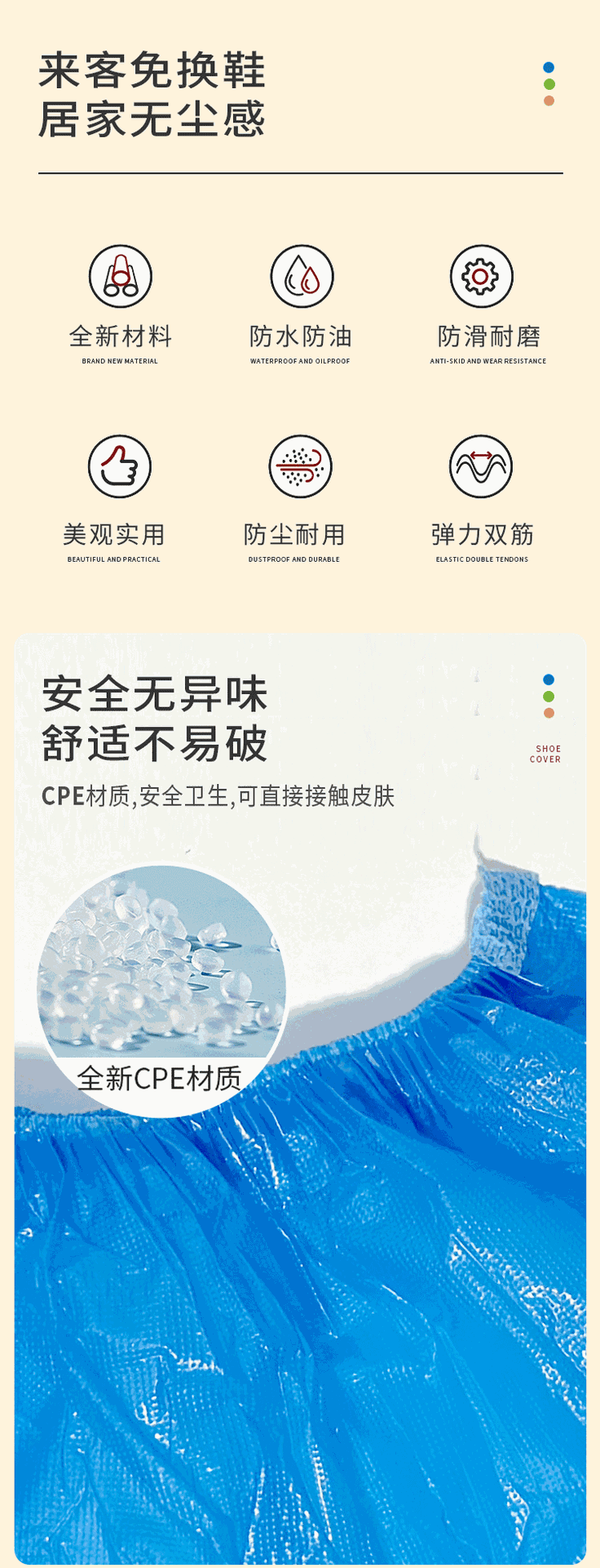 【产品特点】:CPE塑料 表面有凹凸纹路,防滑,面料有柔韧度,拉 扯不易破,行走时声音不大,车间参观出行等推荐购买。