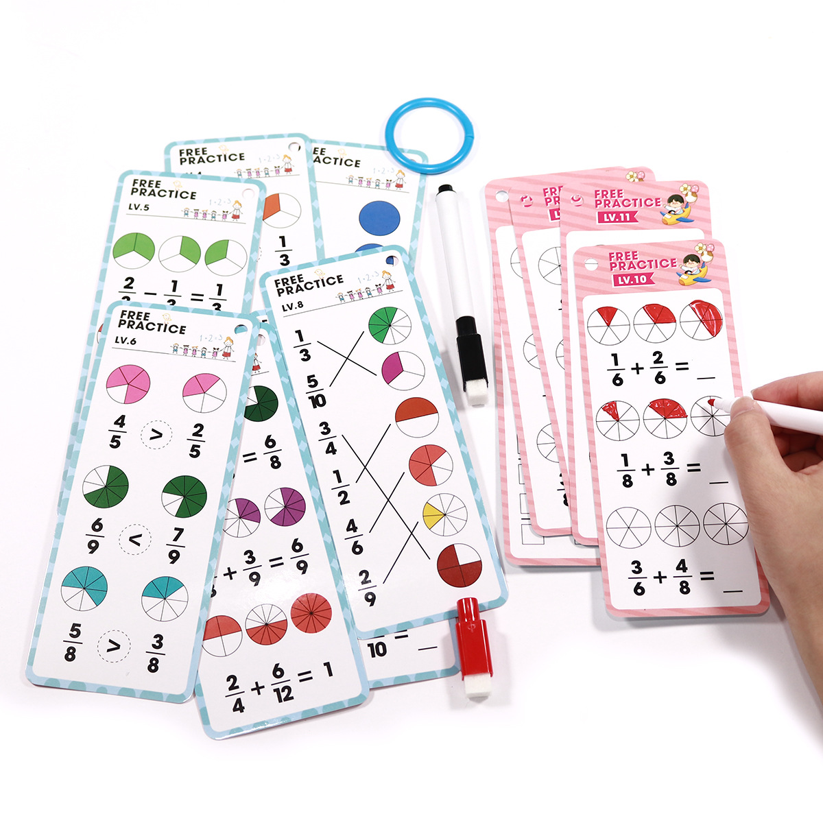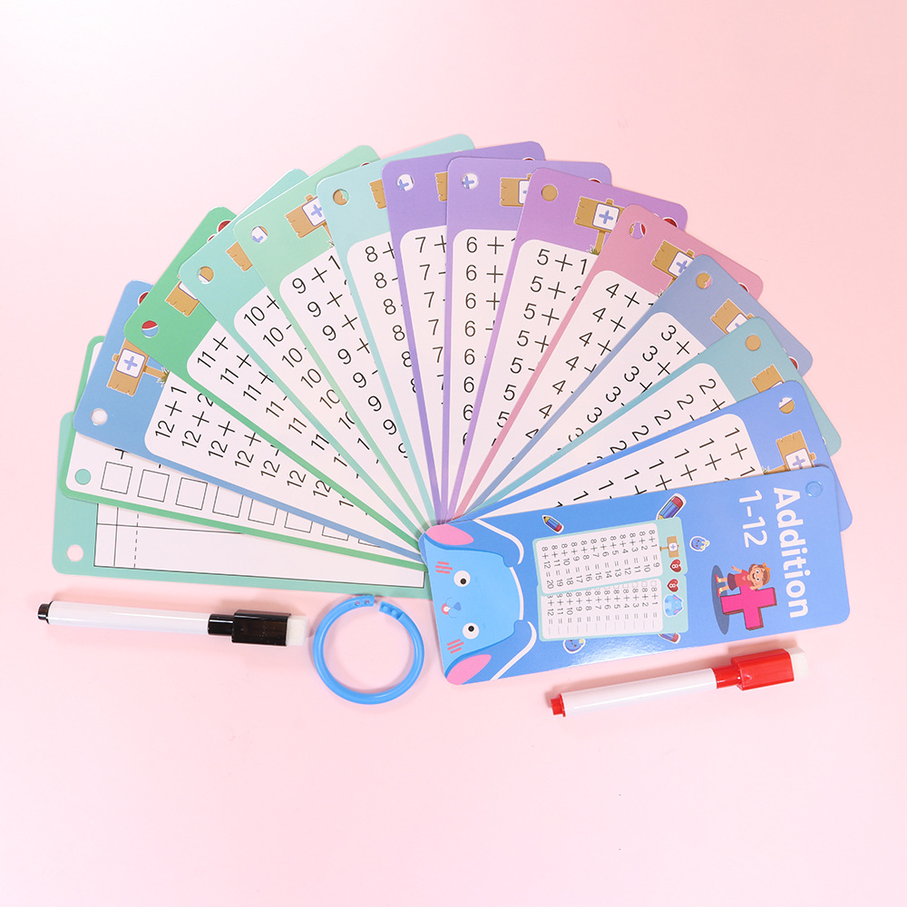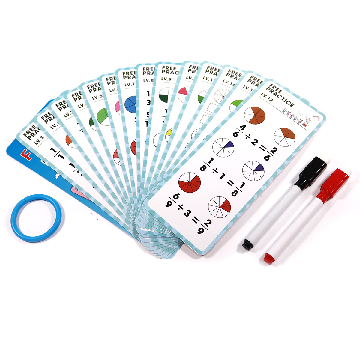 (除法加法减法)15张卡片+1支红色可擦笔+1支黑色可擦笔+1个收纳环入OPP袋子。