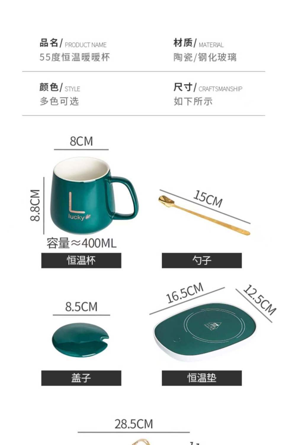 ![]() | Dark green cup lid spoon + constant temperature pad [gift box style] | USB european regulations, american regulations and british regulations | ¥11.0 / ≈ 133 ₽ | 1000000 | 5488271913809 | |