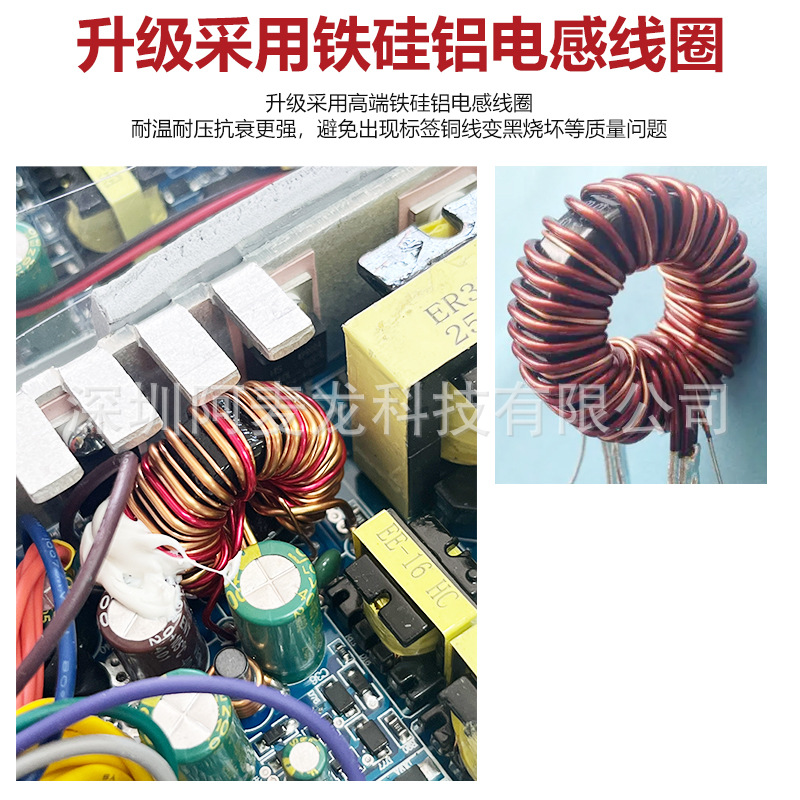 1、升级采用铁硅铝电感线圈遇到高温不会变黑烧坏融化,从而导致不断重启和负载重启。