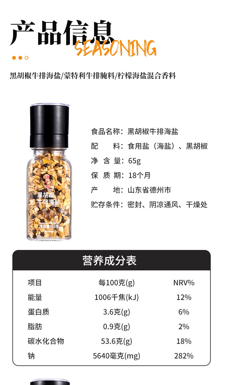 ![]() | Black pepper steak sea salt 65g * 1 | ¥4.9 / ≈ 59 ₽ | 10000 | 5501410376625 |
