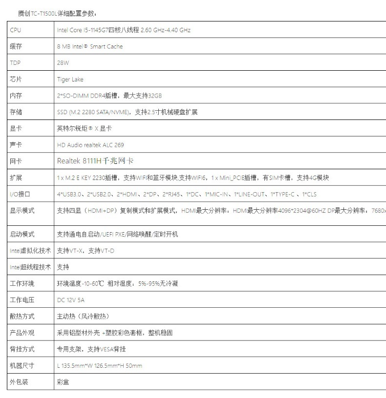 腾创TC-T1700是一款低功耗X86架构的高清桌面云终端,机器采用Intel 酷睿i7系列处理器低功耗仅45W,采用抽拉结构设计,方便更换硬件;双喇叭设计,装饰灯带,外观新颖。支持VESA安装,HDMI+VGA支持双屏显示接口、8*USB接口满足更多外设需求。支持多种桌面虚拟化协议,适用于高校云教室,中小学计算机机房,企业培训中心,图书馆电子阅览室、房地产中介连锁门店、工厂企业管理终端机、教师办公室等VOI/IDV/TCI专用云终端应用的场景。
