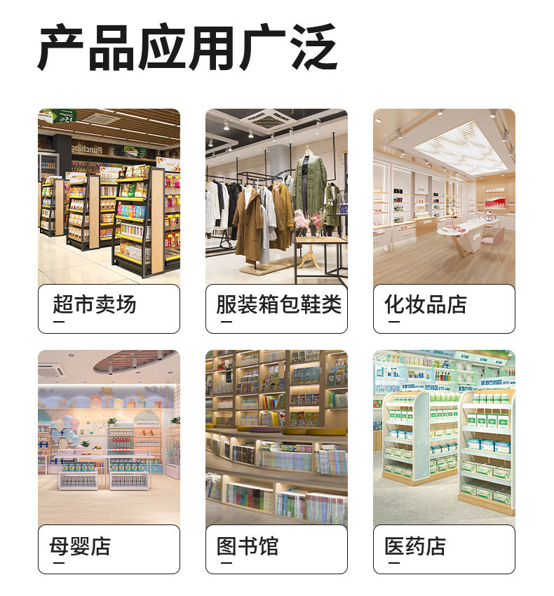 Область применения Supermarket clothing store, cosmetics store, skin care product store, maternal and child store, clothing, shoes and hats, various toys, towels and bedding, etc., bookstore, library