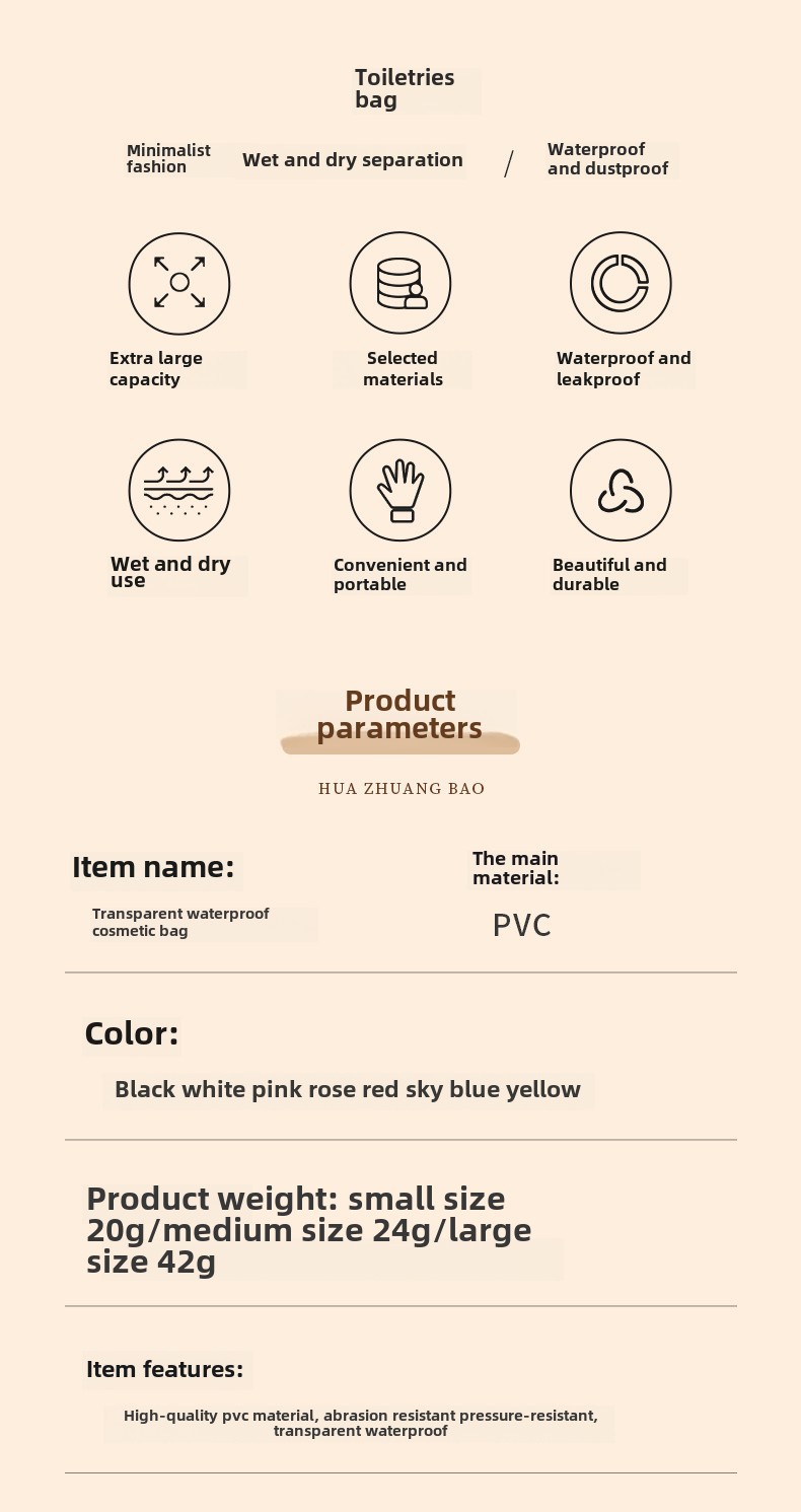 - Waterproof Material:Made from waterproof PVC, this makeup bag protects your cosmetics from getting wet, making it suitable for travel or use in humid environments.
